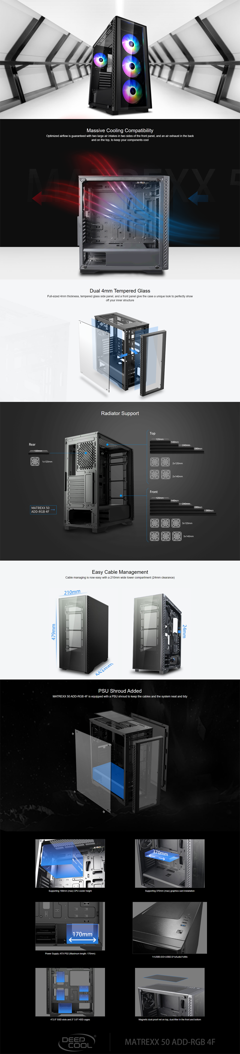 Manufacturer: DeepCool. As a mid-tower case, MATREXX 50 ADD-RGB 4F supports motherboard sizes from mITX to eATX. With two large air intakes and an air exhaust, optimized airflow is guaranteed to keep your components cool.