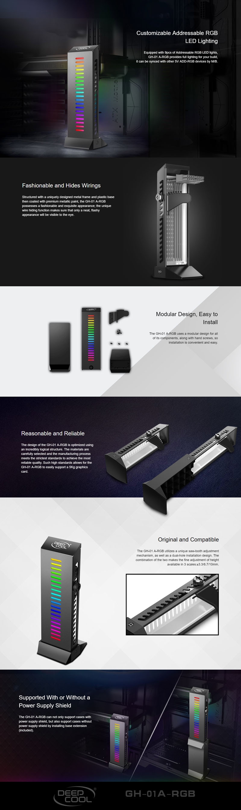 Manufacturer: DeepCool. Equipped with 9pcs of Addressable RGB LED lights, GH-01 A-RGB provides full lighting for your build, it can be synced with other 5V ADD-RGB devices by M/B.