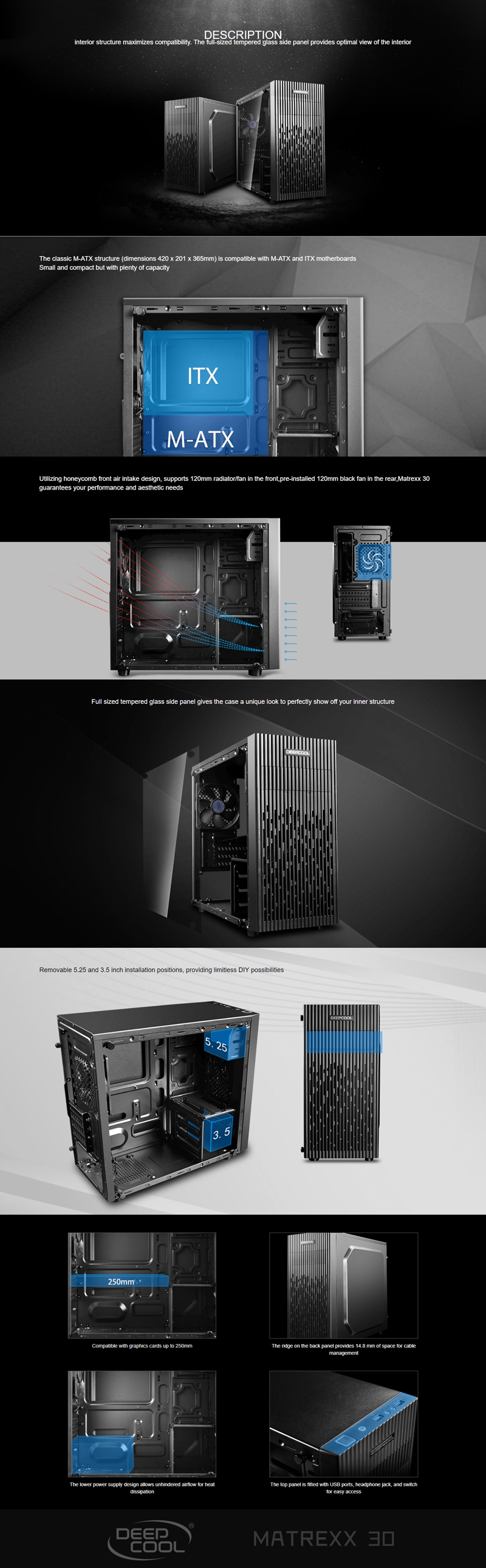 Manufacturer: DeepCool. Matrexx 30 is small-sized M-ATX computer case, perfect for gamers looking to build a small gaming PC. Its logical interior structure maximizes compatibility. The full-sized tempered glass side panel provides optimal view of the interior.