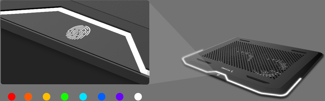 Manufacturer: DeepCool. A notebook stand featuring dual 140mm fans and 16.7 Million RGB LED colours with up to 6 illumination modes. 3 Dynamic modes: waves, cycles and breathing; 3 monochrome modes: constant light, breathing and meteor, up to 8 different colours to choose from.