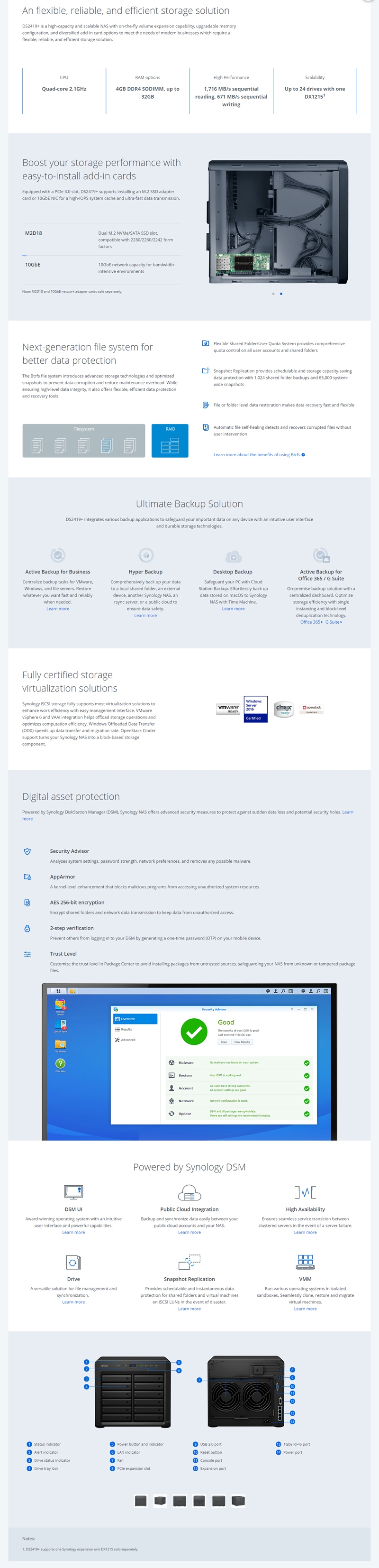 Synology® DiskStation DS2419 is a 12-bay desktop NAS designed for small and medium-sized businesses. This high-capacity and scalable NAS comes with expandable storage capability, upgradable memory configuration, and diversified add-on card optoins, meeting the modern corporate needs for a flexible, reliable and efficient storage solution. Synology DS2419+ is backed by 3 year limited warranty.
