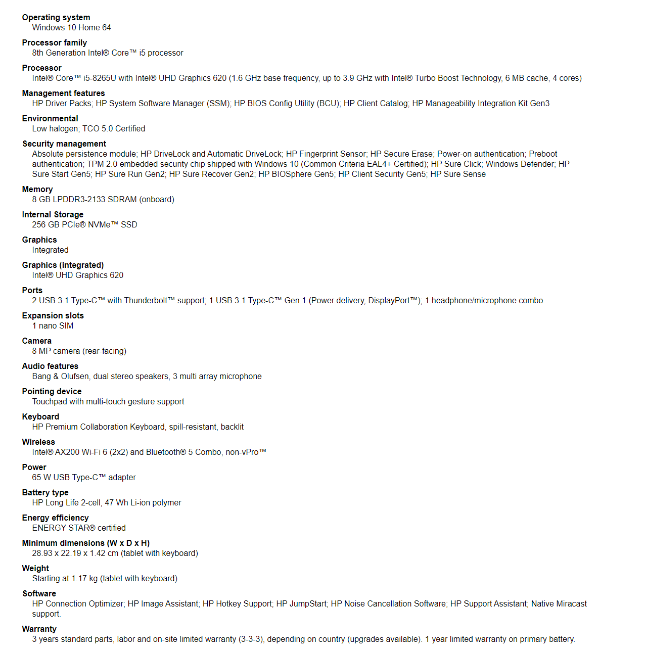 HP Elite x2 G4, 13" 3K2K TS, i5-8265U, 8GB, 256GB SSD, WIN 10 HOME, PEN, KEYBOARD, 3YR ONSITE WTY
