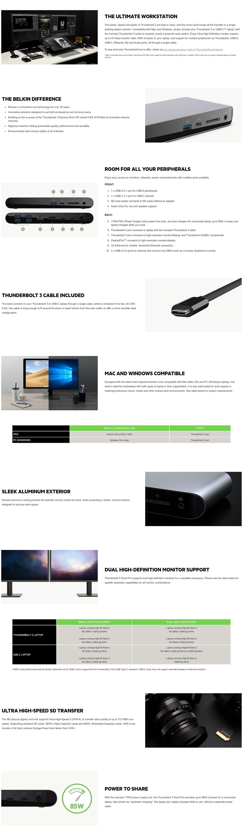 BELKIN THUNDERBOLT3 DOCK, USB-C(1), TB3 PORT (1) 85W PASSTHROUGH, USB-A 3.1(5) (F4U097AU)