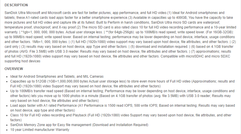 SanDisk Ultra Microsoft and Microsoft cards are fast for better pictures, app performance, and full HD video.(1) Ideal for Android smartphones and tablets, these A1-rated cards load apps faster for a better smartphone experience.(3) Available in capacities up to 400GB, You have the capacity to take more pictures and full HD video and capture life at its fullest. Built to Perform in harsh conditions, SanDisk Ultra micro SD cards are waterproof, temperature proof, shockproof, and X-ray proof.(2) The micro SD card is also rated class 10 for full HD video recording performance and a 10-year limited warranty. | *1gb=1, 000, 000, 000 bytes. Actual user storage less. | **(for 64gb-256gb): up to 100MB/s read speed; write speed lower. (For 16GB-32GB): up to 98MB/s read speed; write speed lower. Based on internal testing; performance may be lower depending on host device, interface, usage conditions and other factors. 1Mb=1, 000, 000 bytes. | (1) full HD (1920x1080) video support may vary based upon host device, file attributes, and other factors. | (2) card only | (3) results may vary based on host device, app Type and other factors. | (5) download and installation required. | (6) based on 4.1GB transfer of photos (AVG. File 3.5MB) with USB 3.0 reader. Results may vary based on host device, file attributes and other factors. | (7) approximations; results and full HD (1920x1080) video support may vary based on host device, file attributes and other factors. Compatible with microSDHC and micro SDXC supporting host devices