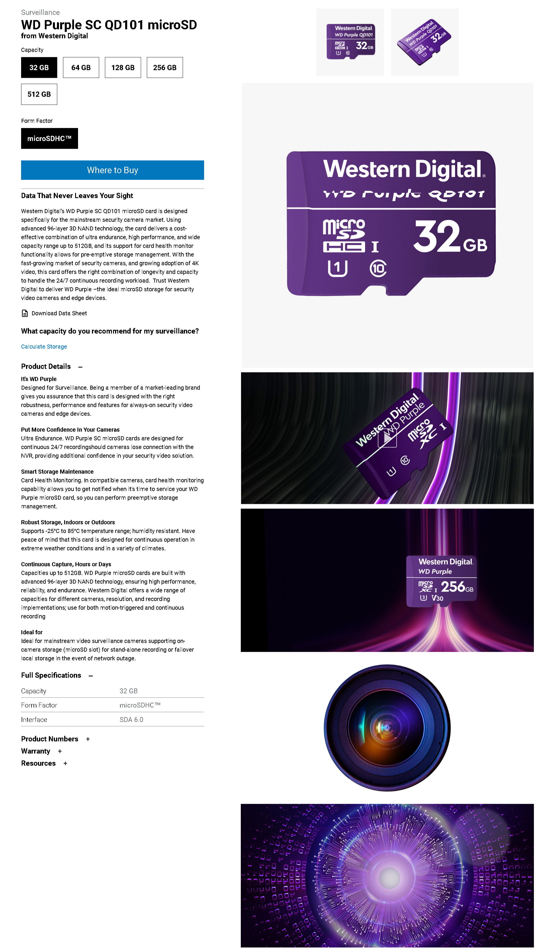 Western Digital WD Purple 32GB MicroSDXC Card 24/7 -25°C to 85°C Weather & Humidity Resistant for Surveillance IP Cameras mDVRs NVR Dash Cams Drones Wdd032G1P0A
