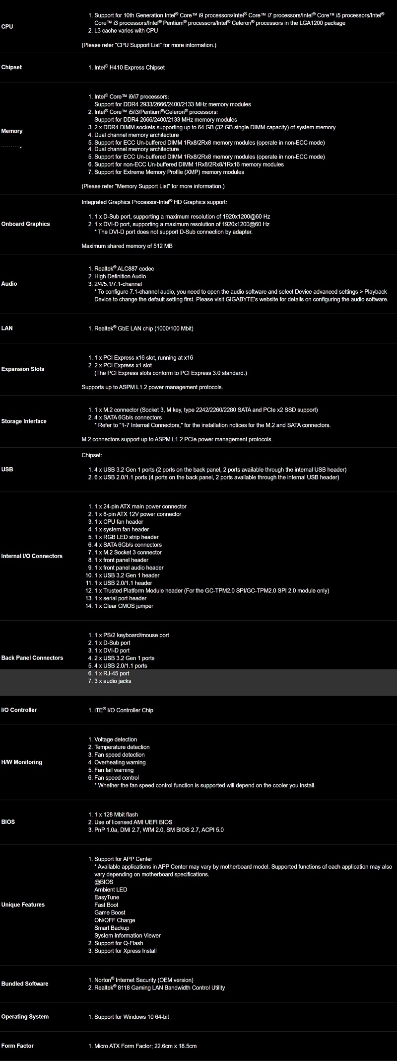 H410 Micro-ATX: Socket 1200 For Intel 10th Gen. Processors 2x DDR4, 4x SATA 6Gb/s, 1x M.2, USB 3.2, Gigabit LAN, DVI-D/VGA, mATX