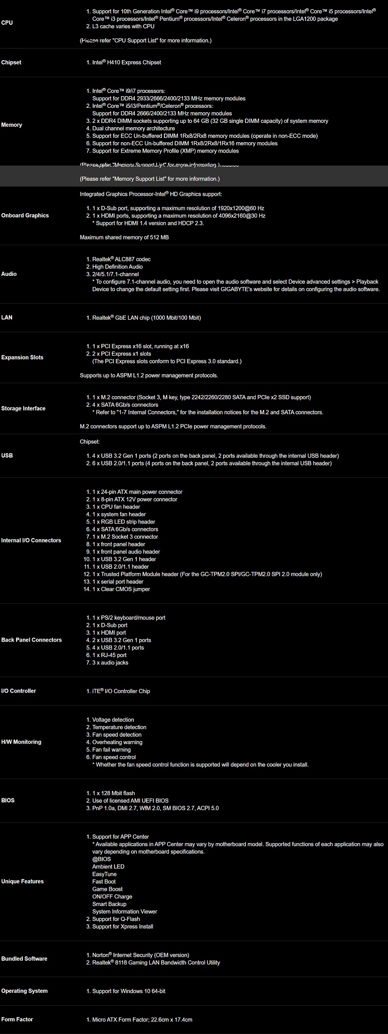 H410 Micro-ATX: Socket 1200 For Intel 10th Gen. Processors 2x DDR4, 4x SATA 6Gb/s, 1x M.2, USB 3.2, Gigabit LAN, HDMI/VGA, mATX