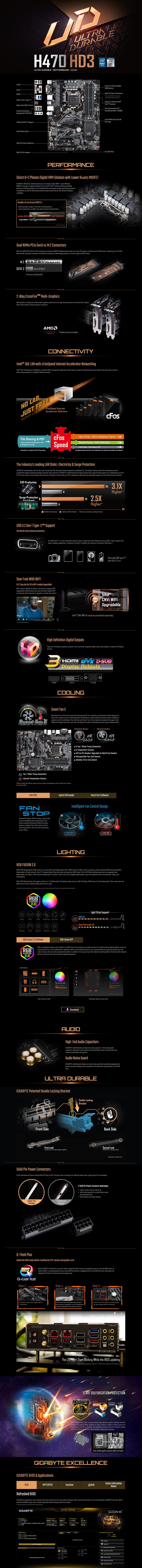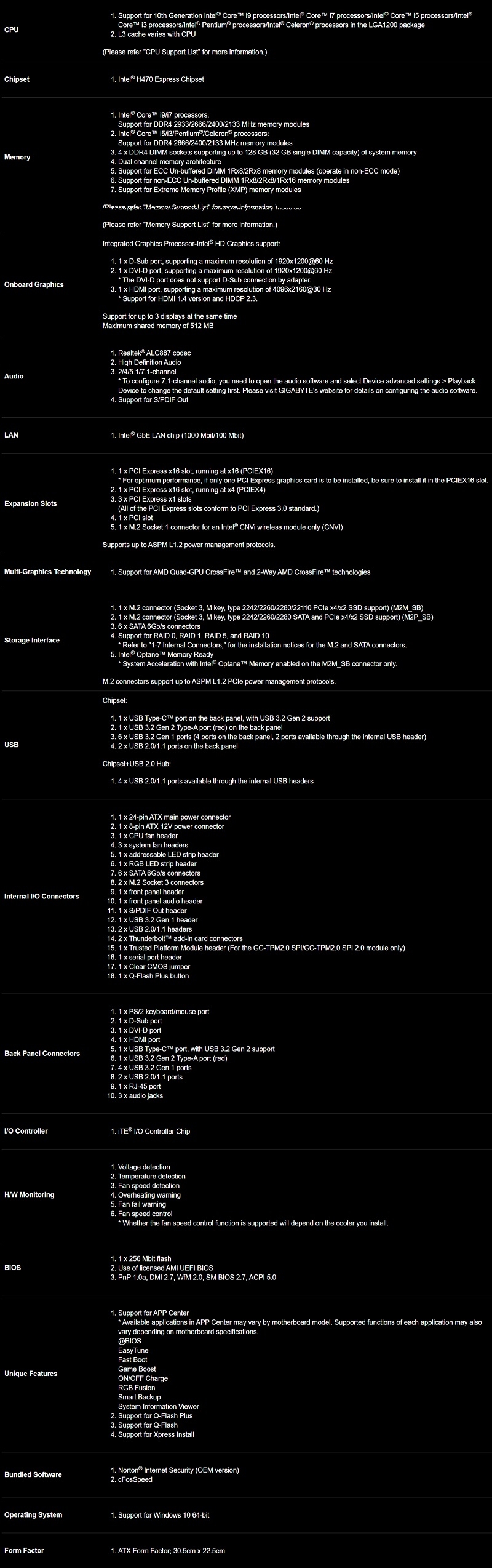H470 ATX: Socket 1200 For Intel 10th Gen. Processors 4x DDR4, 6x SATA 6Gb/s, 2x M.2, USB 3.2, Gigabit LAN, HDMI/DVI-D/VGA, CrossFire, RAID, RGB Fusion 2.0