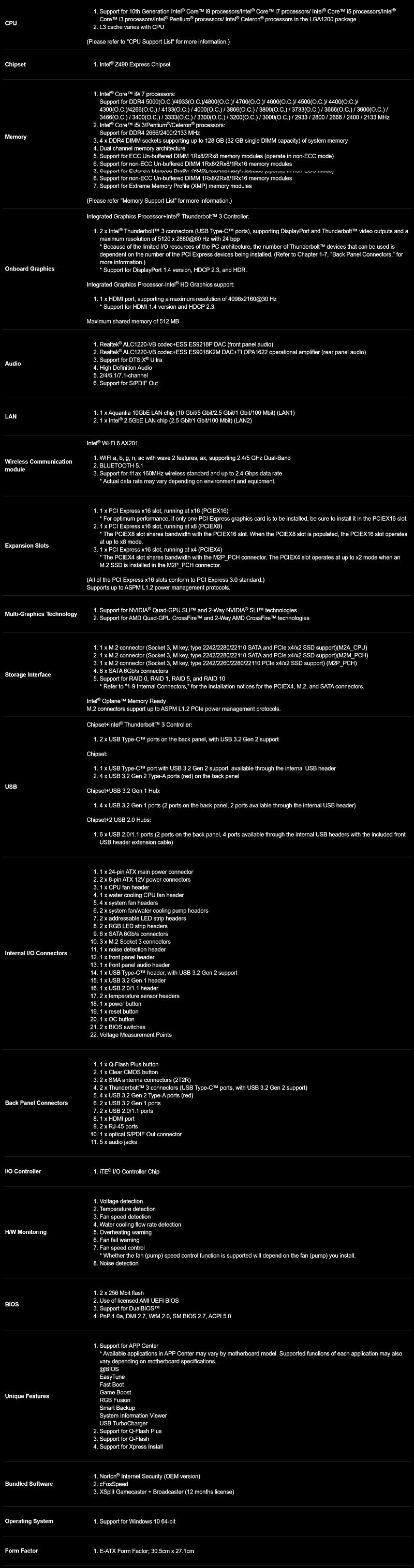 Z490 E-ATX: Socket 1200 For Intel 10th Gen. Processors 4x DDR4, 6x SATA 6Gb/s, 3x M.2, USB 3.2, 10GbE + 2.5GbE LAN, Wi-Fi 6 AX201+ BT5.1, 2x Thunderbolt 3(TYPE-C Port) / HDMI, CrossFireX/SLI, Raid