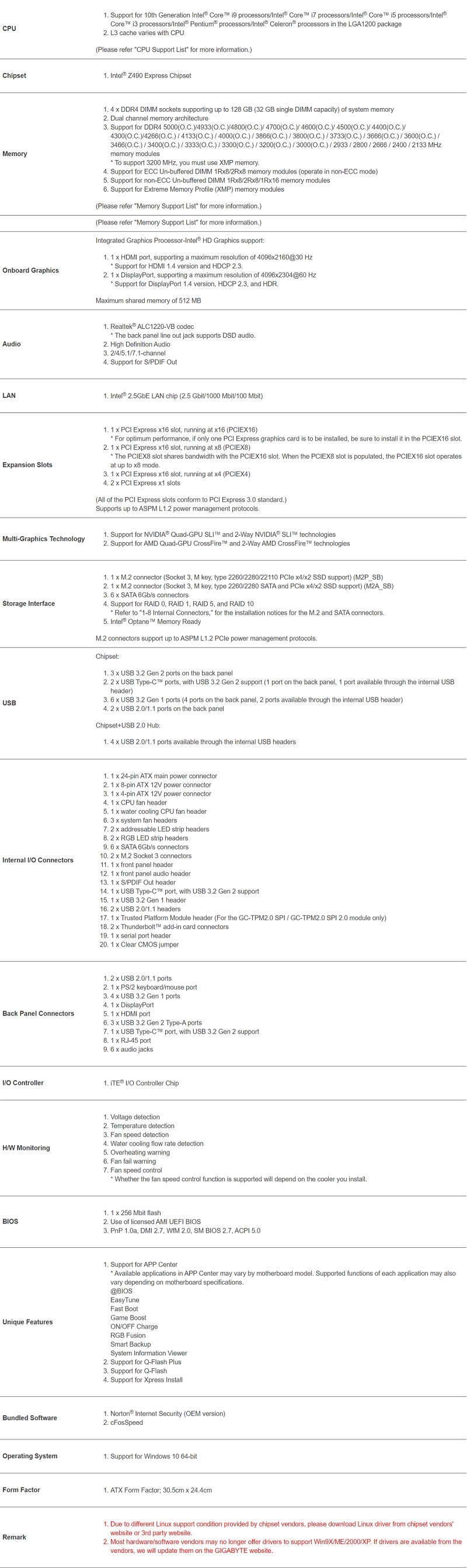 Z490 ATX: Socket 1200 For Intel 10th Gen. Processors 4x DDR4, 6x SATA 6Gb/s, 2x M.2, USB 3.2, 2.5GbE LAN, HDMI/DP, CrossFire/SLI, Raid, RGB FUSION 2.0