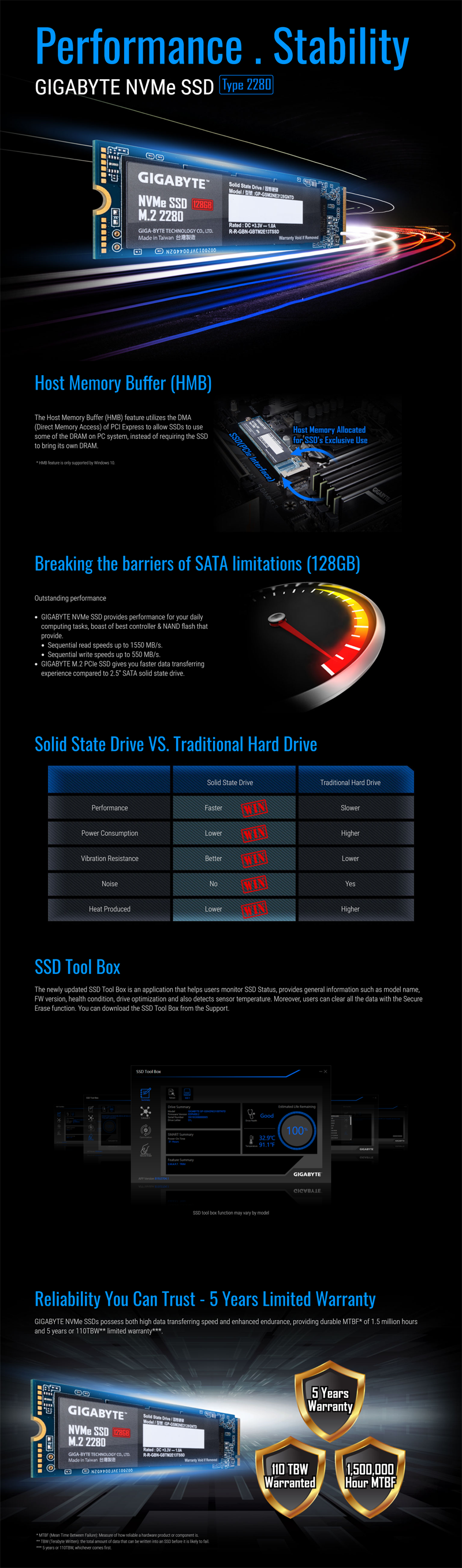 | Product Description | Gigabyte - solid state drive - 128 GB - PCI Express 3.0 x4 (NVMe) |