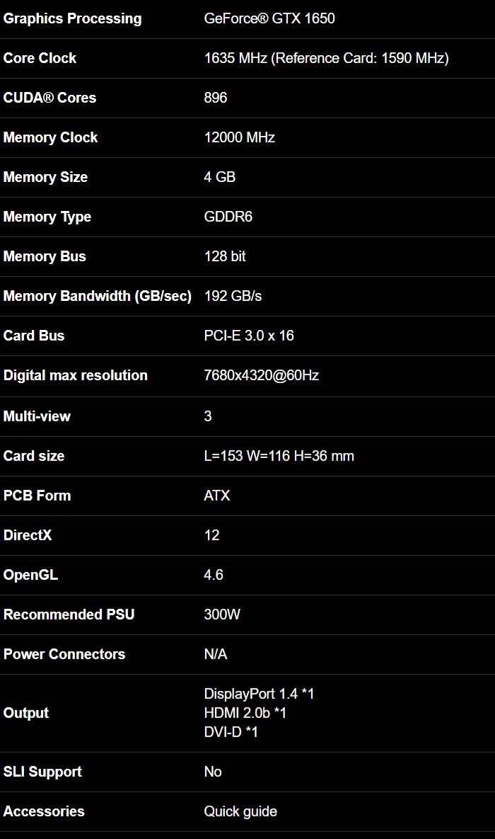 nVidia GeForce GTX1650 OC 4GB GDDR6, OC Boost Clock: 1635MHz, Max Resolution: 7680x4320 @60Hz, DP/HDMI/DVI-D