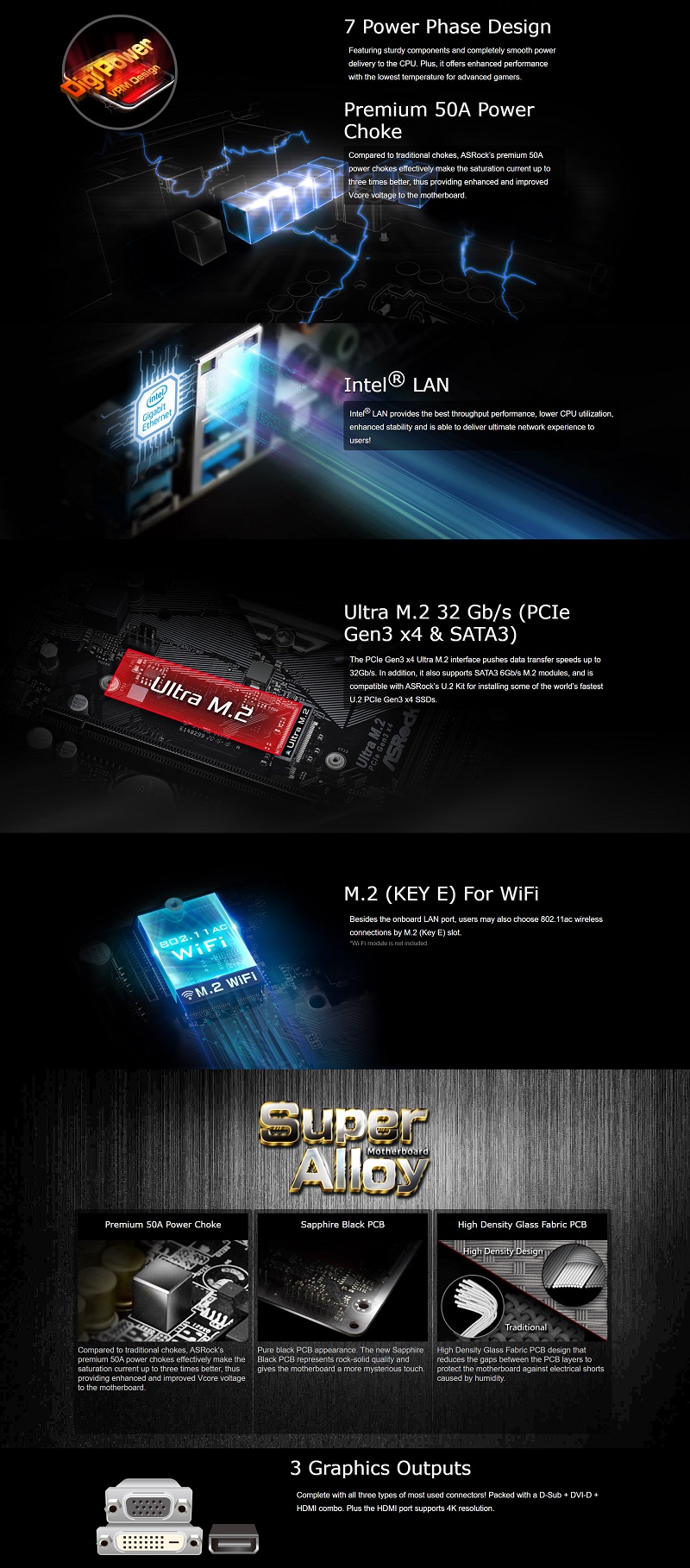 ASRock Super Alloy - Premium 50A Power Choke - Sapphire Black PCB - High Density Glass Fabric PCB ASRock Ultra M.2 (PCIe Gen3 x4 & SATA3) ASRock Full Spike Protection (for all USB, Audio, LAN Ports) ASRock Live Update & APP Shop |