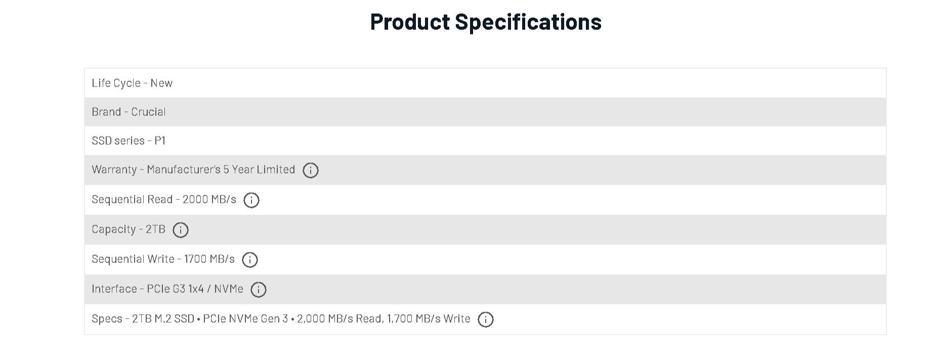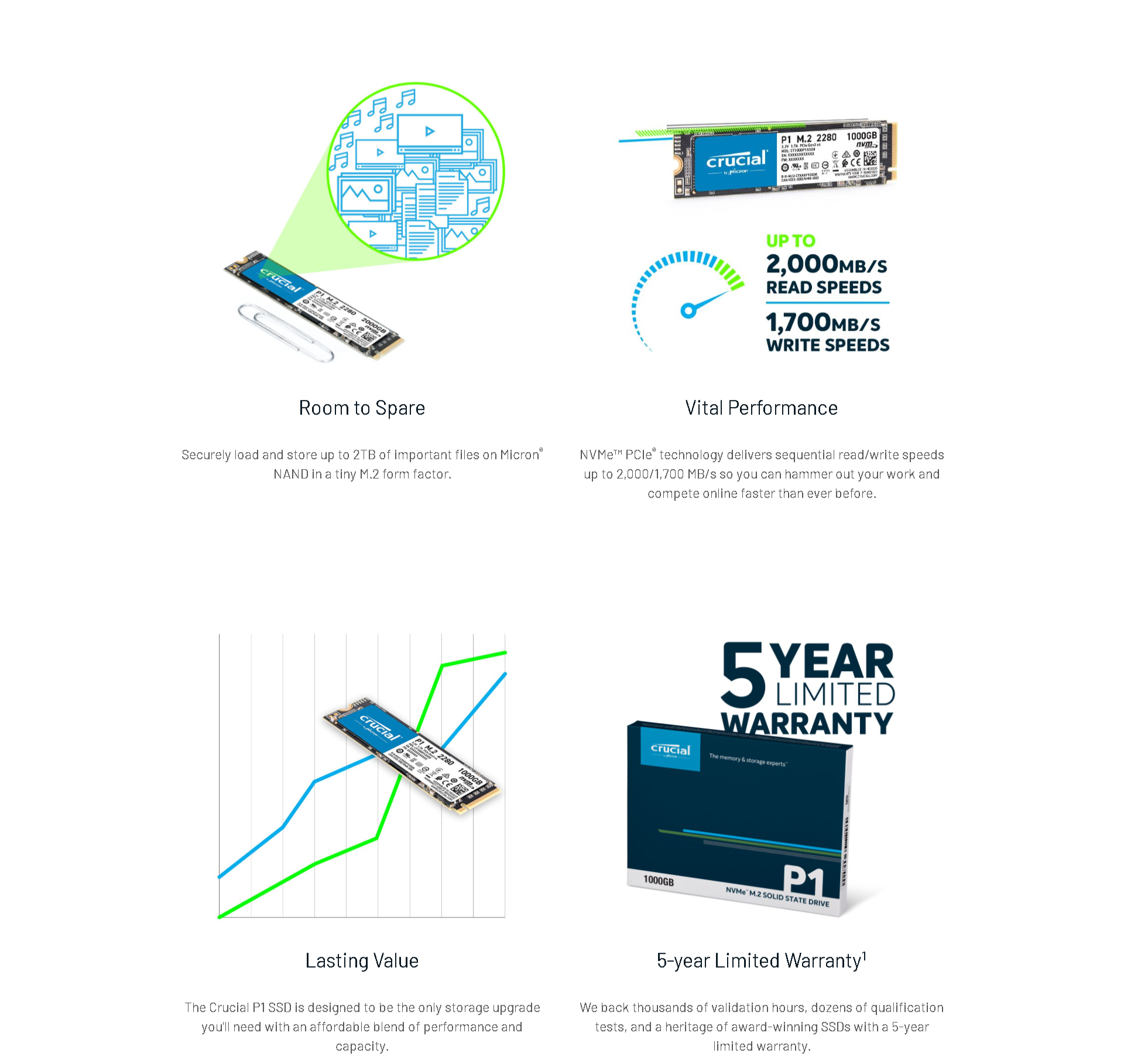 Crucial P1 2TB M.2 (2280) NVMe PCIe SSD - 3D NAND 2000/1700 MB/s Acronis True Image Cloning Software 5 yrs wty Ct2000P1Ssd8
