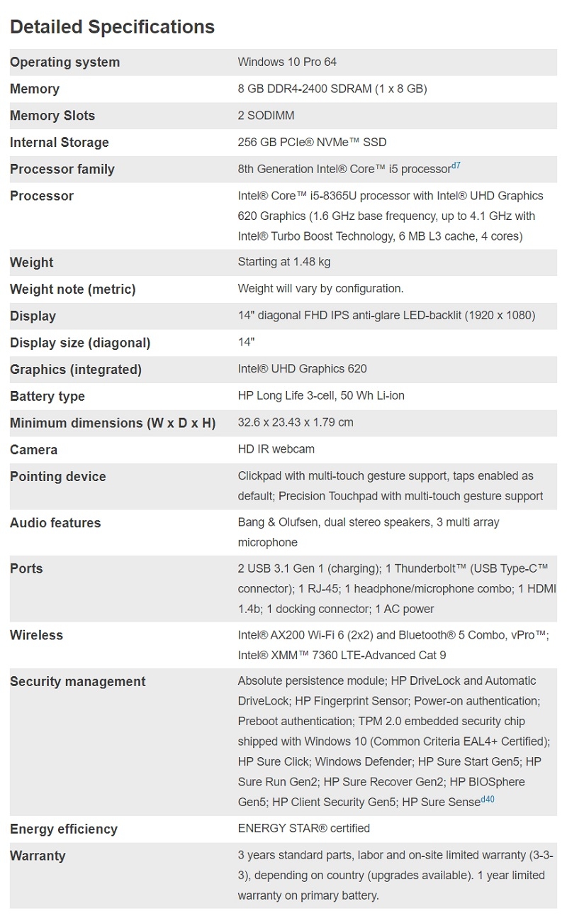 I5-8365U Vpro 8Gb(1X8Gb) (Ddr4) Ssd-256Gb 14"(1920X1080) Wlan(Wifi6)+Bt+Wwan(Lte) Webcam-Ir W10P-64B 3Yr Onsite 8Eb19Pa