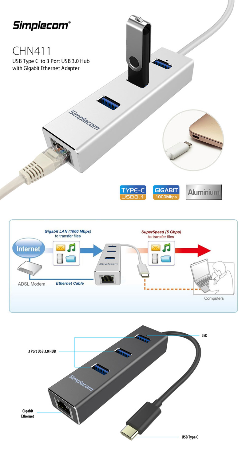 Simplecom CHN411 Silver Aluminium USB Type C to 3 Port USB 3.0 Hub with Gigabit Ethernet Adapter - CBAT-USBCLAN