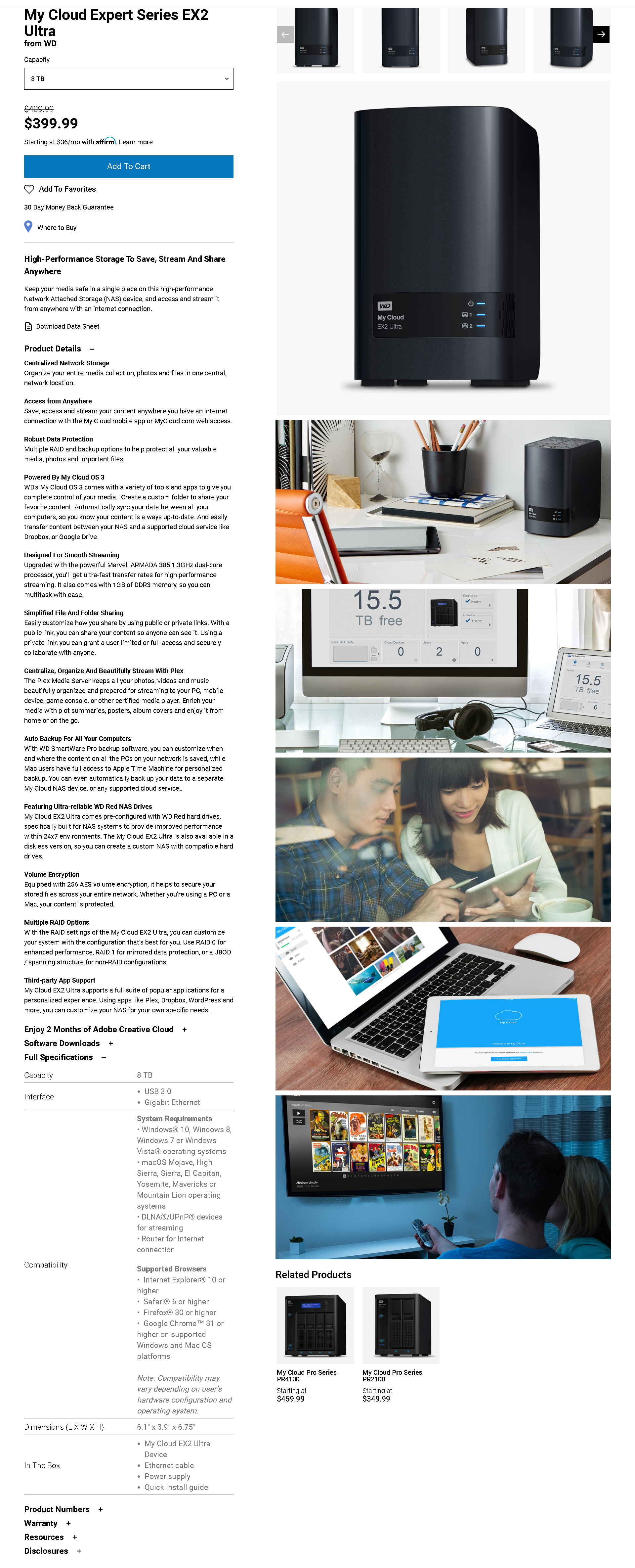 Western Digital WD My Cloud EX2 Ultra Diskless 2 Bay 8TB NAS 1.3GHz Dual-Core 1GB DDR3 RAID 2xUSB3.0 GbE LAN Sync Auto Backup 256 AES Encrypt Windows Wdbvbz0080Jch-Sesn