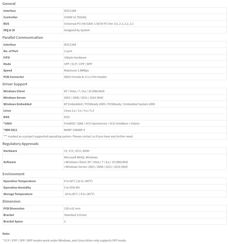 High reliability SUNIX UL7502AQ Parallel controller on-board.