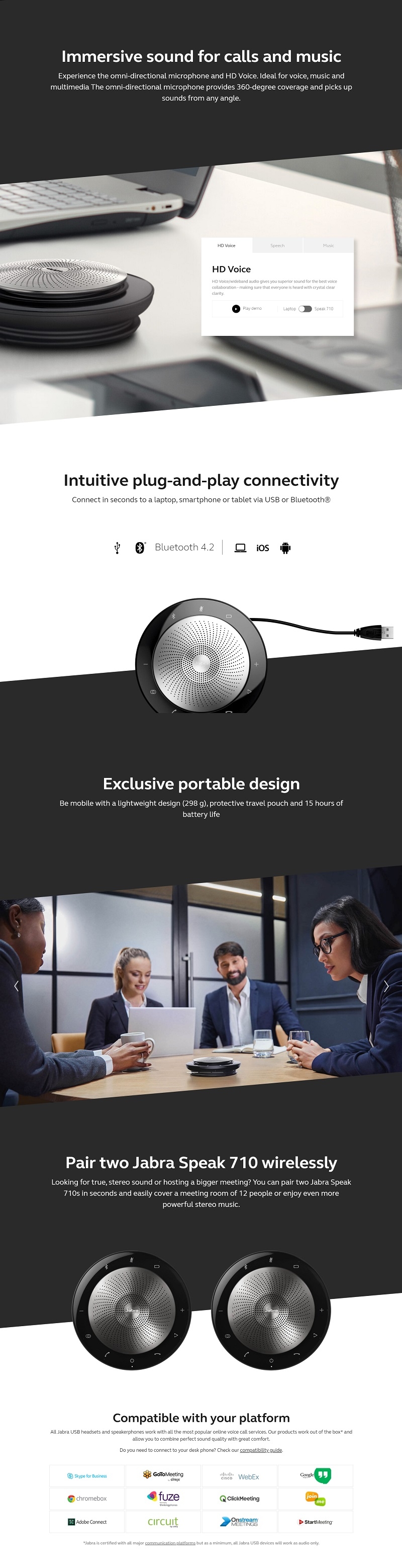 The Jabra Speak 710 UC USB/BT is a speakerphone which allows you to achieve a high-quality sound with a premium and stylish design. It has a special features such as omni-directional microphone that can accommodate up to 6 attendees in a room with superb sound performance. This speakerphone is portable and has one-touch pairing capabilities for linking two Speak 710 units expanding the range. It also offers a micro USB charging interface and supports multiple bluetooth profiles. In addition, the speak 710 MS is optimized for Microsoft Skype for Business.