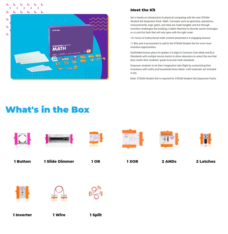 littleBits STEAM Student Set Expansion Pack: Math - Get a hands-on introduction to physical computing with the new STEAM Student Set Expansion Pack: Math. Concepts such as geometry, operations, measurements, logic gates, and data are made tangible and fun through invention challenges like building a Cipher Machine to decode secret messages or a Lock-Out Safe that will only open with the right code! 12+ hours of instructional math content presented in 6 engaging lessons 11 Bits and 4 accessories to add to the STEAM Student Set for even more invention opportunities Scaffolded lesson plans for grades 3-5 align to Common Core Math and ELA Standards with multiple lesson tracks to allow educators to select the one that best meets their studentsÂ’ grade level and math standards Note: STEAM Student Set is required for STEAM Student Set Expansion Packs