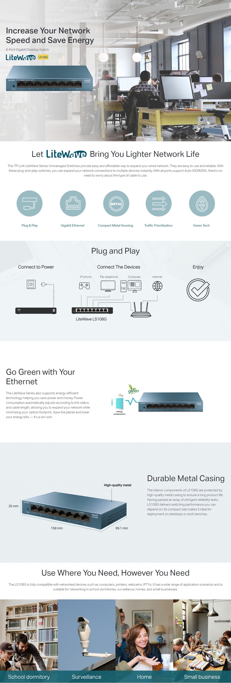 Tp-Link 8 Port Unmanaged Desktop Switch 10/ 100/ 1000 (8) Auto Negotiation Black 3 Yr Wt Ls108G