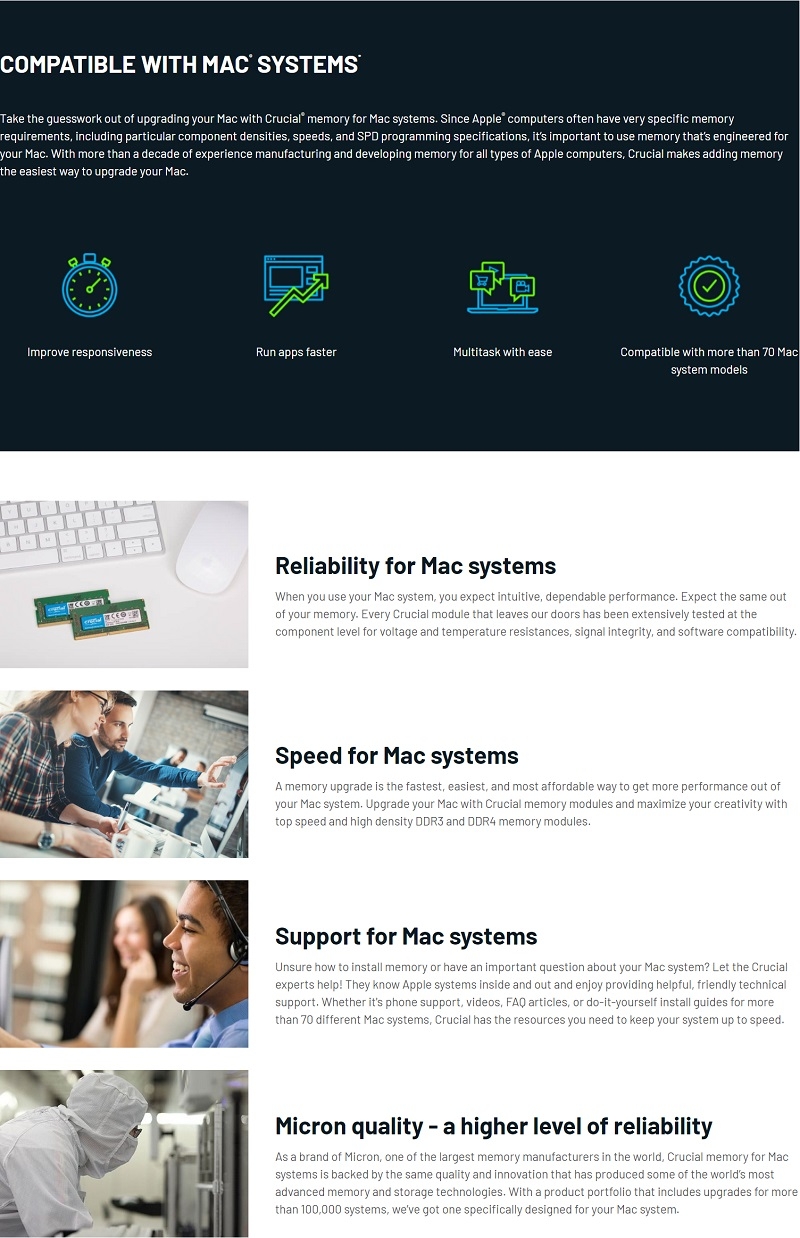 | Specs - DDR3 PC3-12800 • CL=11 • Unbuffered • NON-ECC • DDR3-1600 • 1.35v/1.5v (Dual Profile) • lead free • halogen free • for Mac |