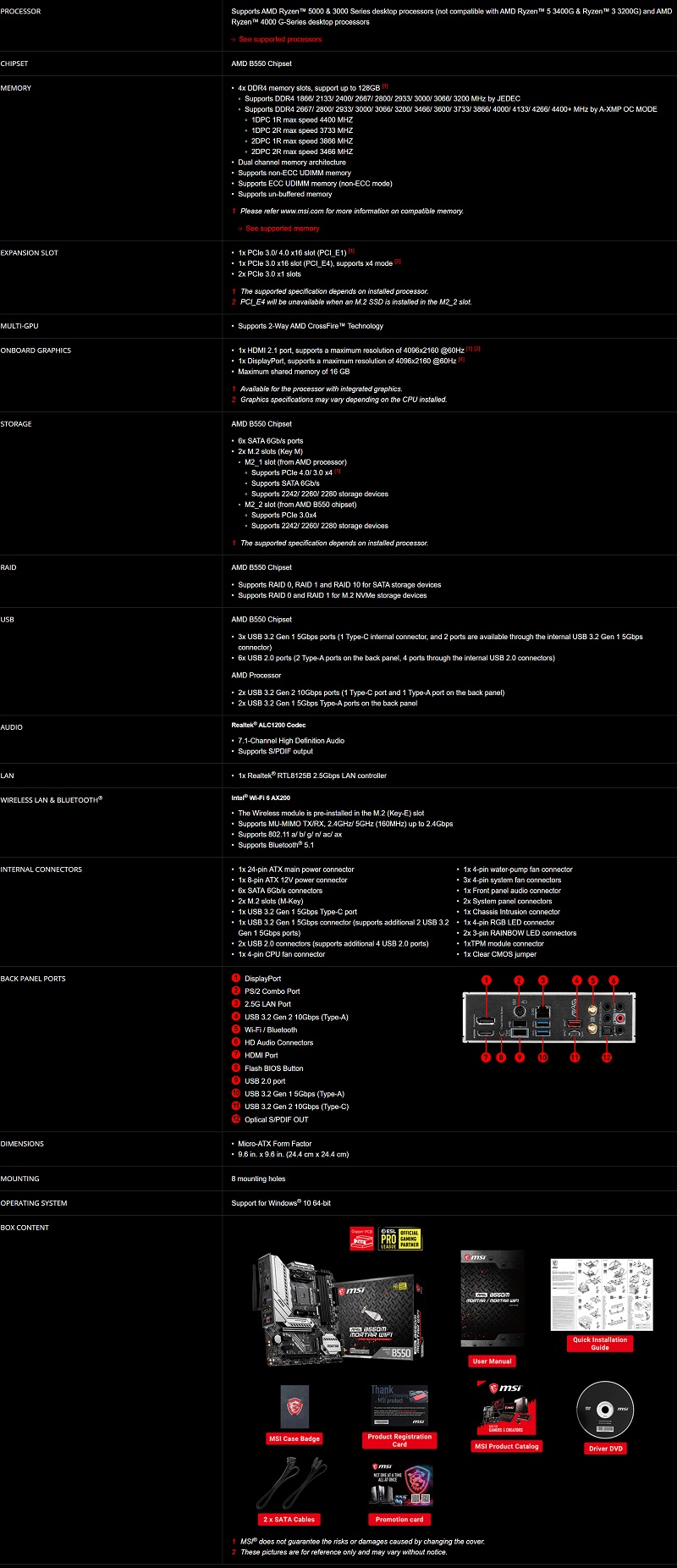 MB B550 Micro-ATX: AM4 socket For 3rd Gen AMD Ryzen processors Dual M.2, 4x DDR4, PCIe 3.0/4.0, 6x SATA 6Gbps,Intel Wi-Fi 6 AX200, USB 3.2, HDMI/DP