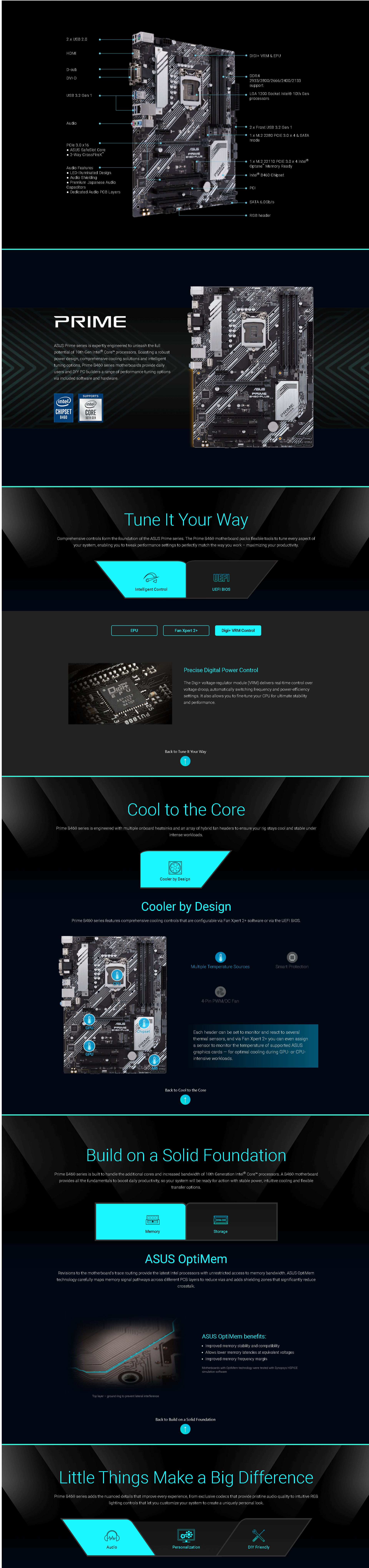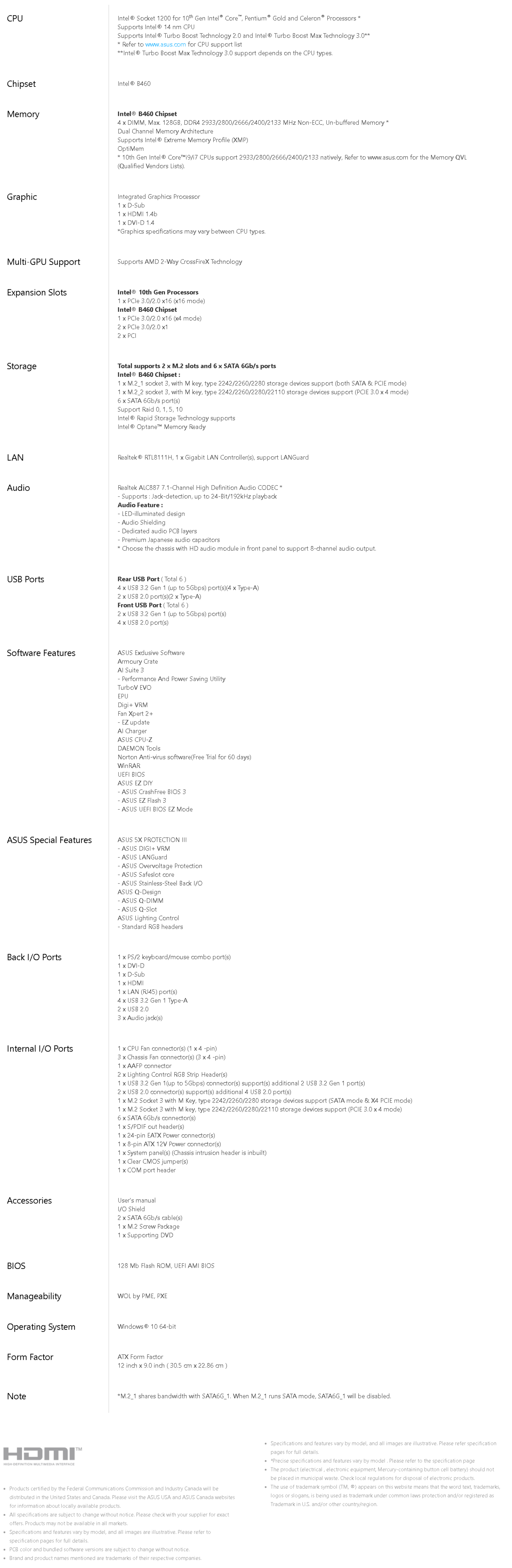 ASUS PRIME B460-PLUS ATX Motherboard 10th Gen LGA1200 DDR4 2933MHz, 2xM.2 6xSATA, HDMI, DVI, D-Sub, CrossFire Prime B460-Plus