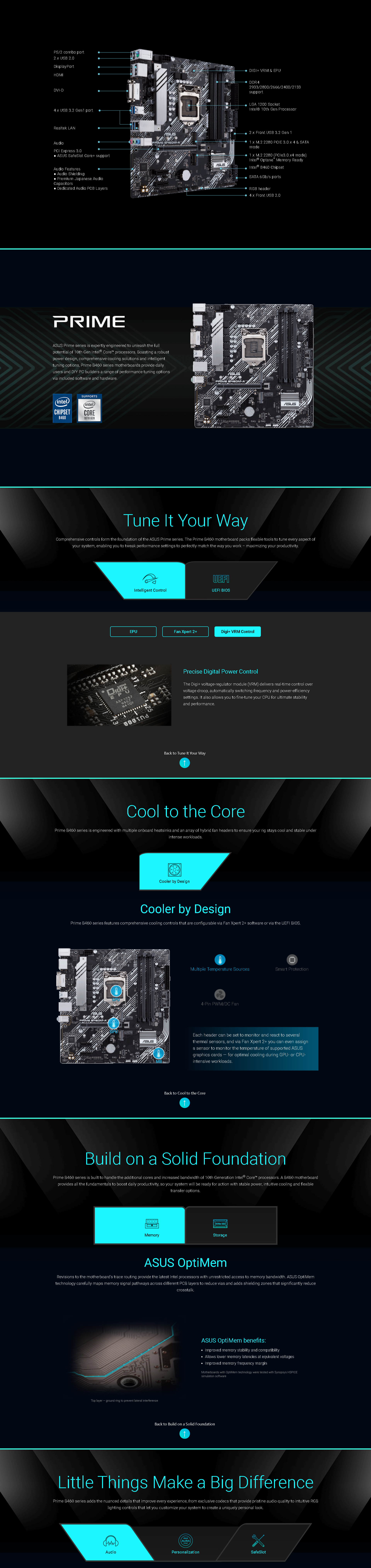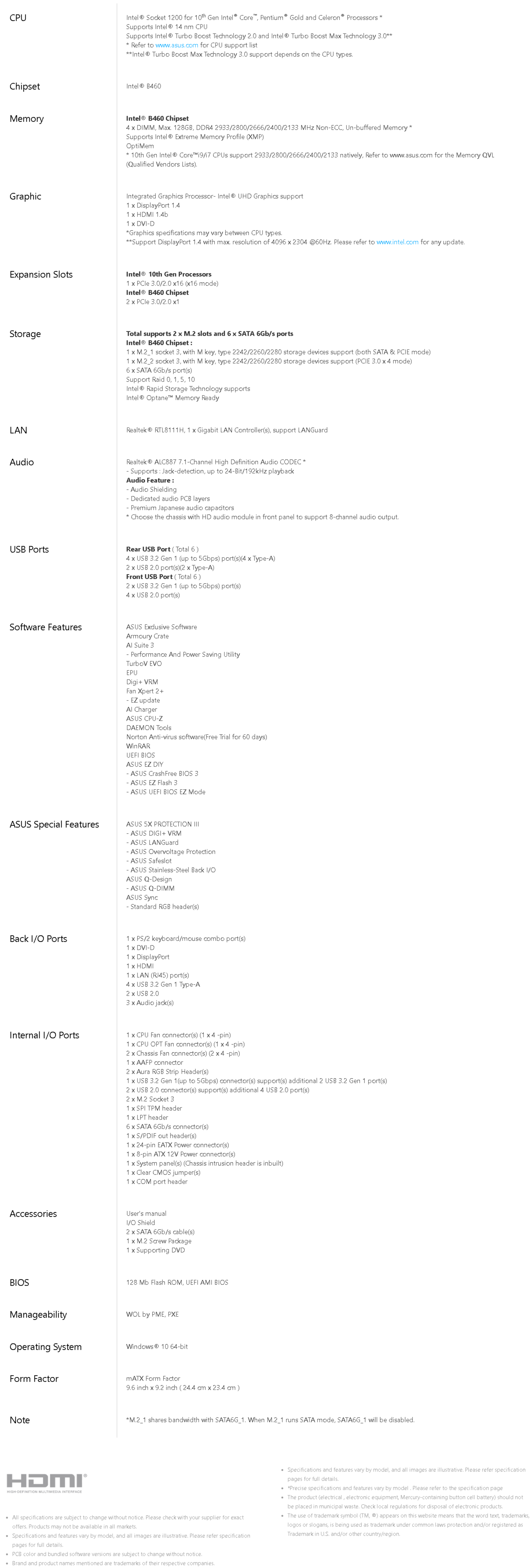 ASUS PRIME B460M-A mATX Motherboard Intel 10th Gen LGA1200 DDR4 2933MHz, 2xM.2, 6xSATA, DP, HDMI, DVI-D, LANGuard, Raid, Aura Sync Prime B460M-A