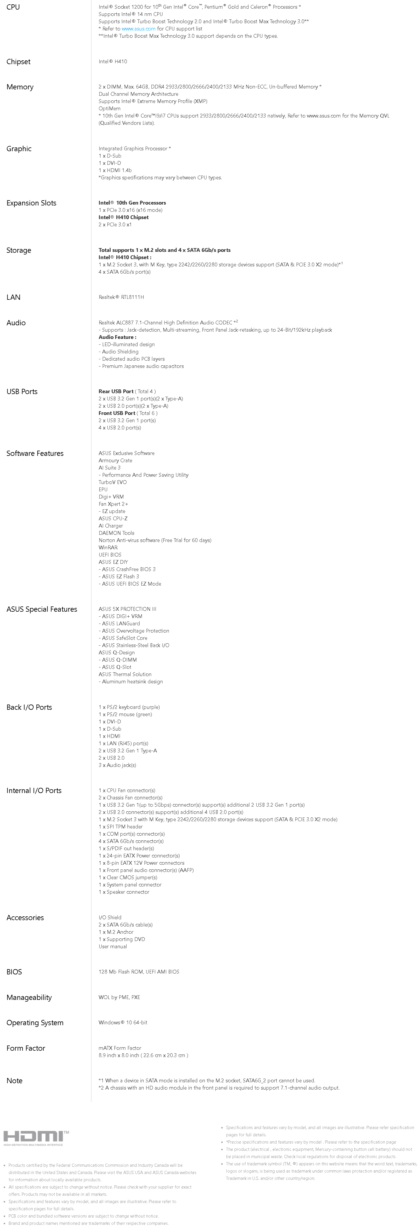 ASUS PRIME H410M-A mATX Motherboard 10th Gen LGA1200 DDR4 2933MHz 1xM.2 4xSATA HDMI DVI-D D-Sub Prime H410M-A