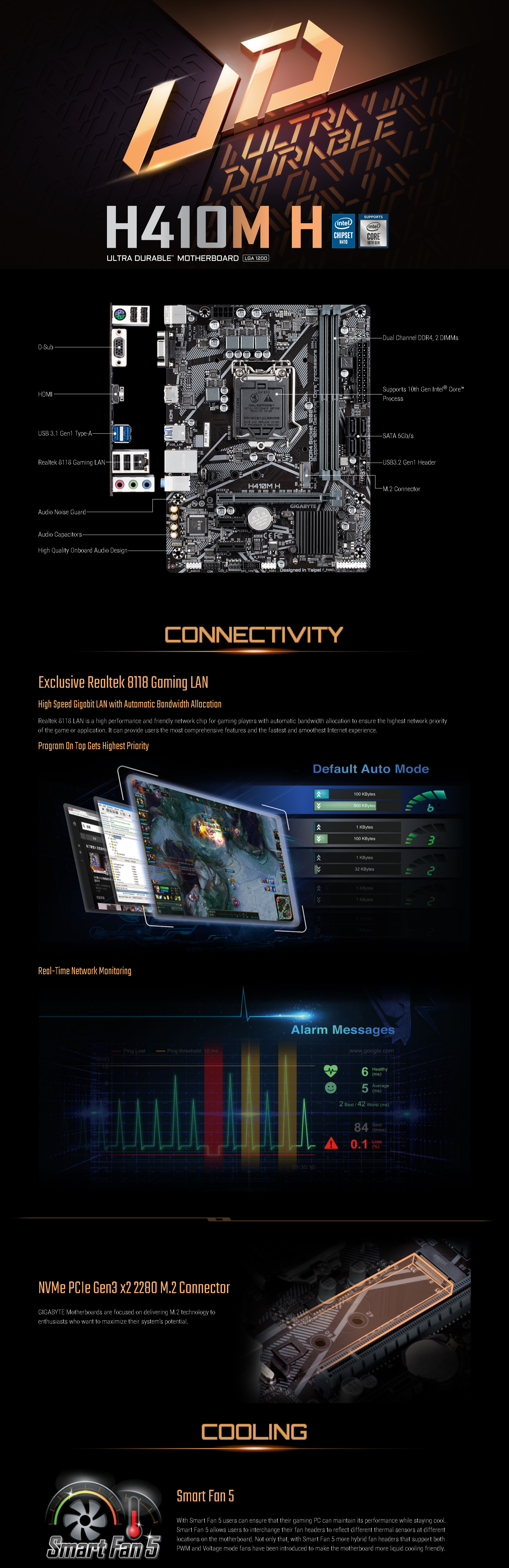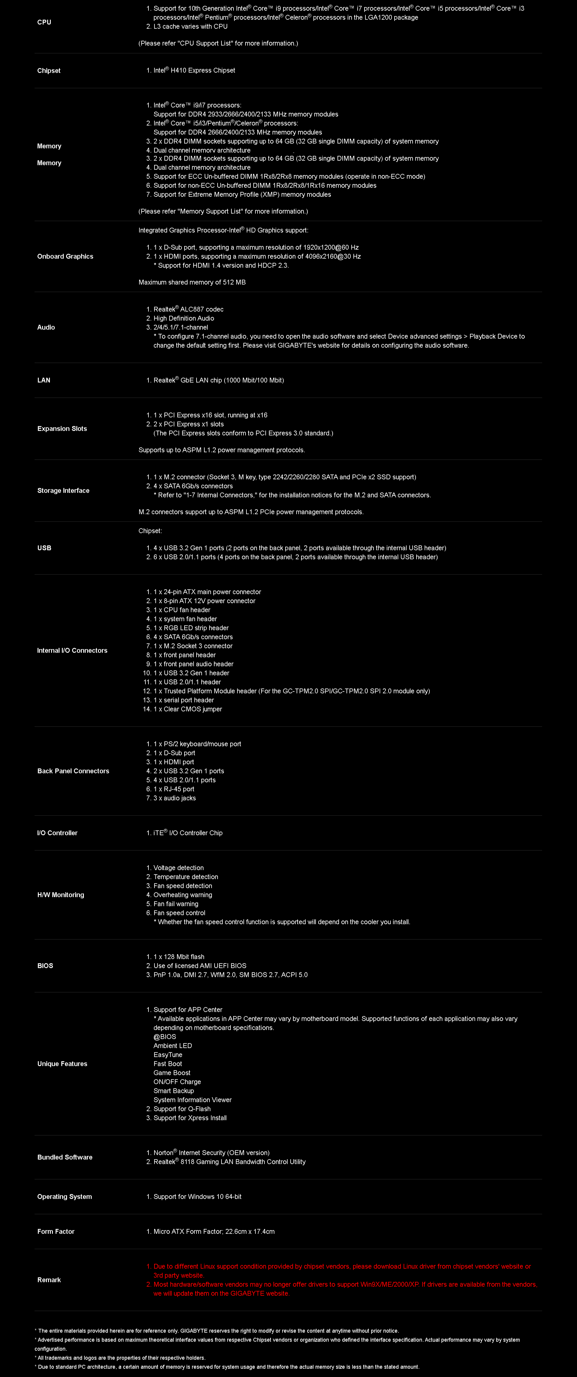 Gigabyte H410M H Micro ATX Motherboard 2xDDR4 10th Gen LGA1200 1xM.2 4xSATA LAN (1000 Mbit/100 Mbit) 1xHDMI 2xPCIE 4xUSB3.2 6xUSB2.0 Ga-H410M-H