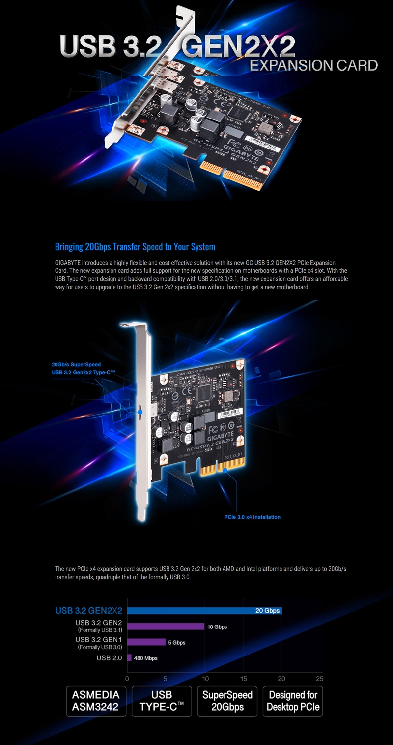 Gigabyte Usb 3.2 Gen 2X2 Expansion Card 20Gb/ S Data-Transfer Asmedia Asm3242 Usb 3.2 Type-C Pcie 3.0*4 Gc-Usb-3.2-Gen2X2