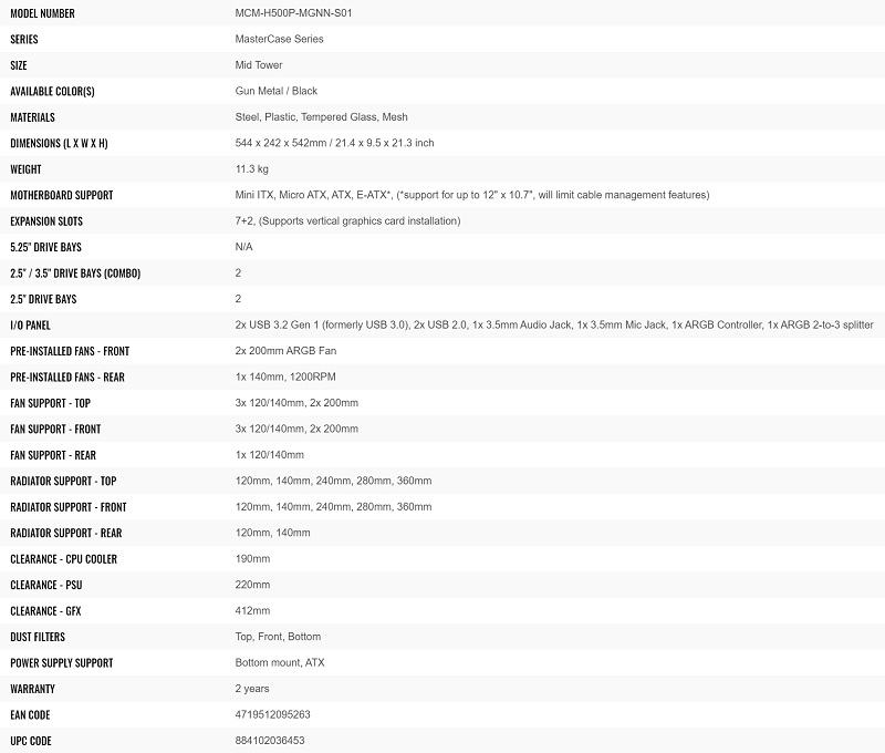 Mid-Tower Case: MasterCase H500P A.RGB, Tempered Glass Window, High Air Flow with 2x 200mm Addressable RGB Fans, Support Vertical VGA Card Mounting(PCIE Raiser Cable Is No Included), Not Support ODD, Support Motherboard A.RGB Sync, Supports: ATX/mATX/mini-ITX