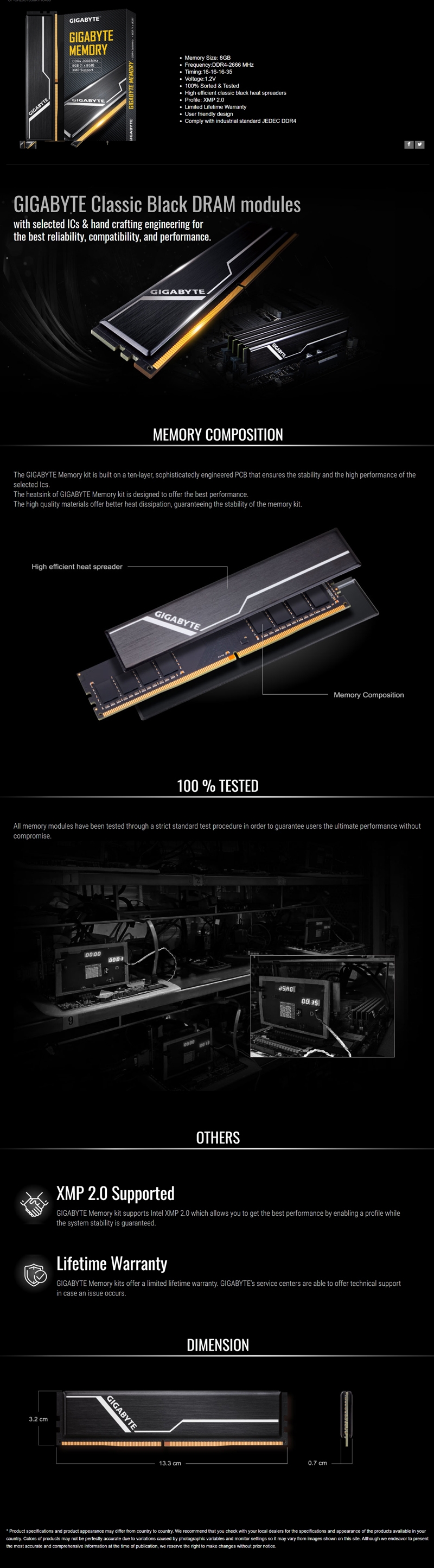 Gigabyte Gaming Memory 8Gb (1X8Gb) Ddr4 2666Mhz C16 1.2V 16-16-16-35 Xmp 2.0 Dual Channel Kit Aluminum Black Heatsinks Pc Desktop Ram Gp-Gr26C16S8K1Hu408