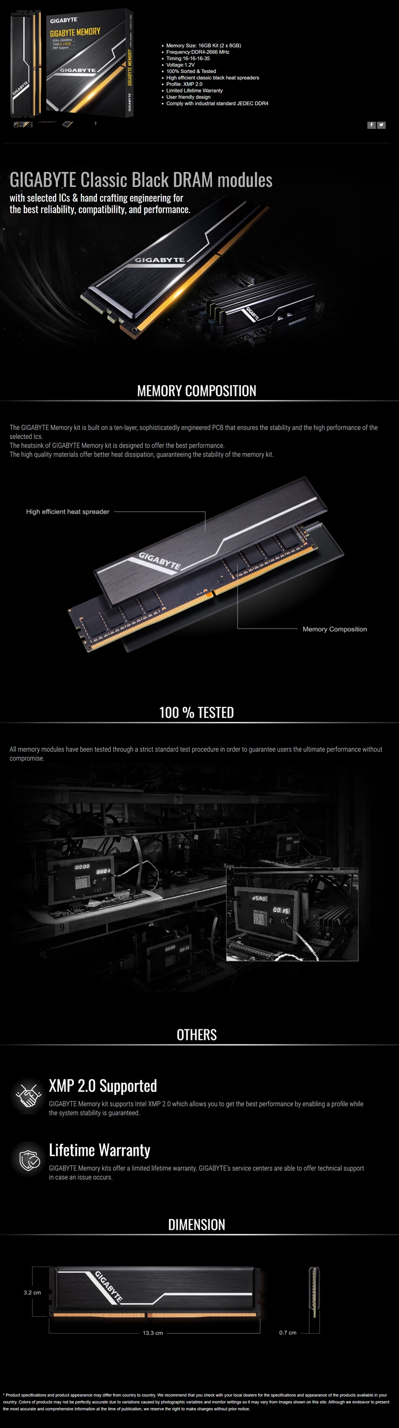 Gigabyte Gaming Memory 16Gb (2X8Gb) Ddr4 2666Mhz C16 1.2V 16-16-16-35 Xmp 2.0 Dual Channel Kit Aluminum Black Heatsinks Pc Desktop Ram Gp-Gr26C16S8K2Hu416
