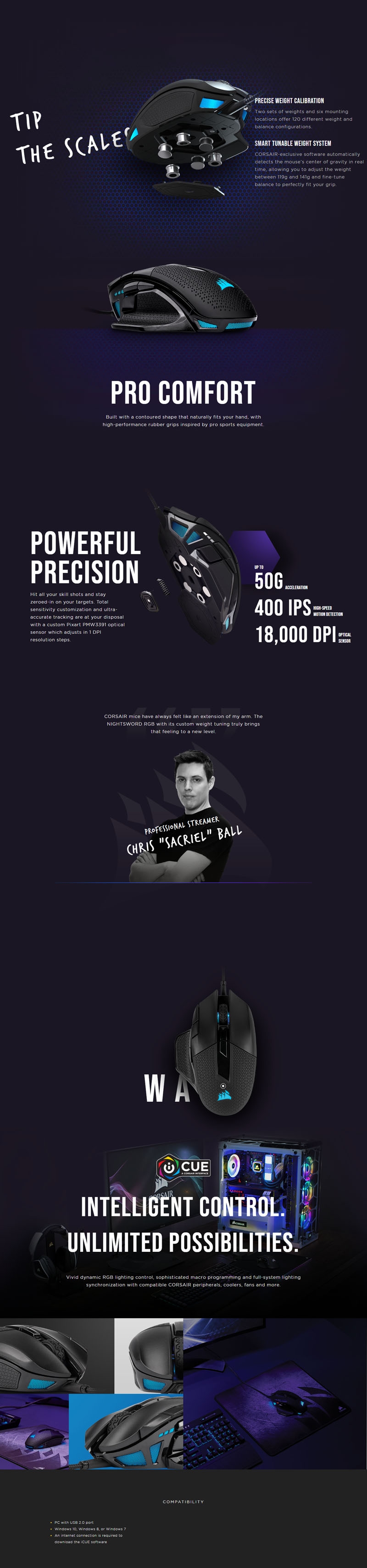 Corsair Nightsword Rgb Smart Tunable Fps/ Moba 18000 Dpi Gaming Mouse Ch-9306011-Ap