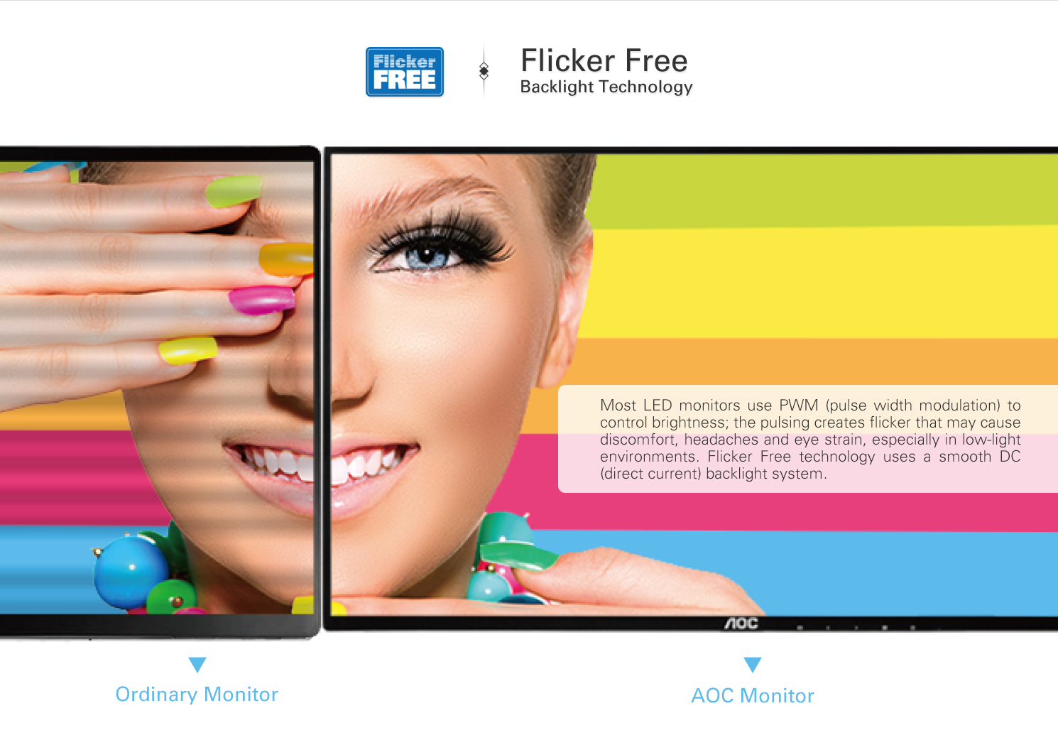 Introducing AOCs 90V series easy-to-use I2790VQ display featuring a medium-sized 27 screen with Full HD (1920 x 1080) resolution, a frameless design, VESA mount compatibility, and top-tier eye protection through Flicker-Free and AOC Low Blue Mode. Low Blue Mode filters harmful short-wave blue light at a variety of levels to suit different scenarios. Suitable for any home or office.