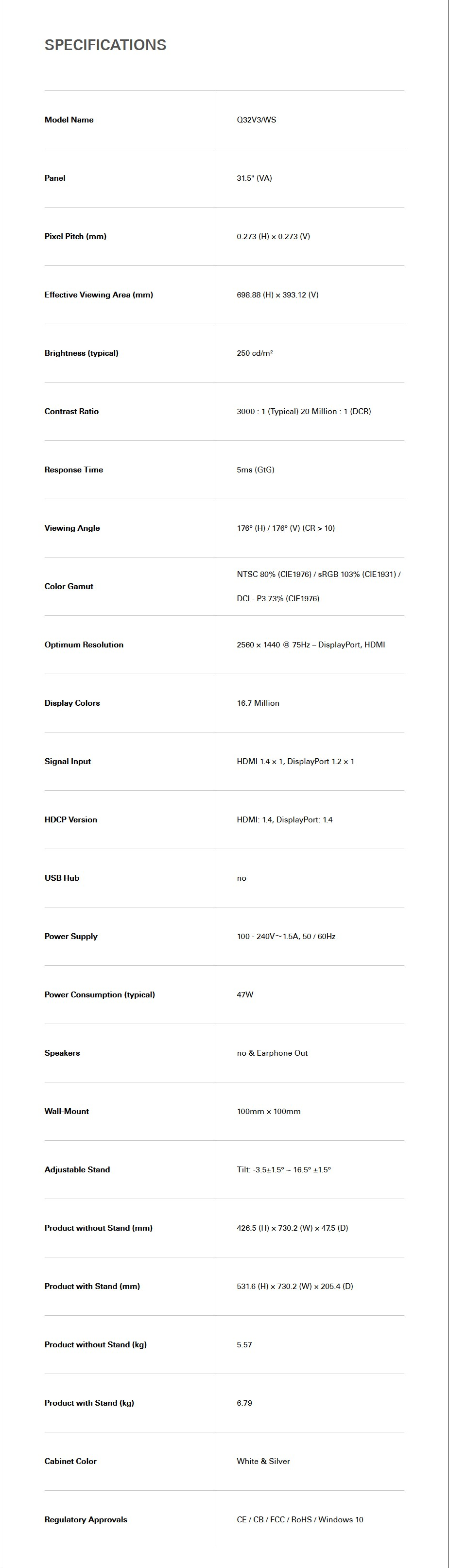 Aoc 31.5" Va 5Ms 2560X1440 QHD Monitor Q32V3/Ws