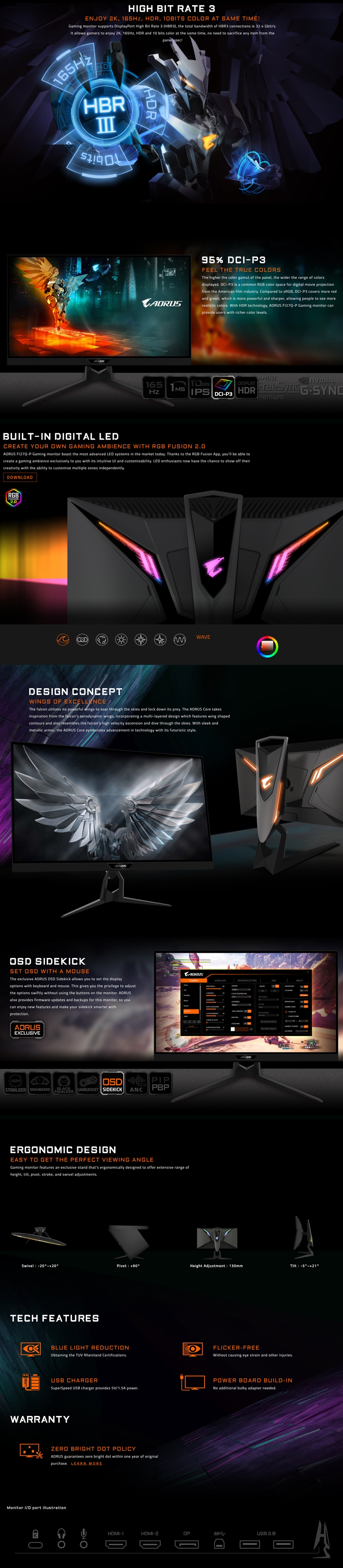 Gigabyte Aorus Fi27Q 27" Tactical Gaming Monitor Qhd 165Hz 1Ms Hdr Freesync G-Sync 10Bits Ips Dci-P3 Swivel Pivot Tilt Height Adjust Hdmi Dp Ad27Qd Fi27Q