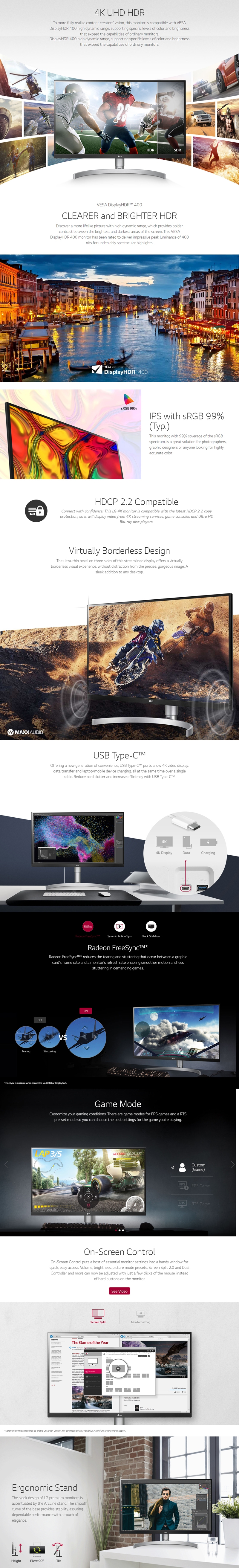 LG 27" Ips 5Ms 4K 3840X2160 Hdr400 Freesync 3-Side Borderless Monitor - 27UL850-W
