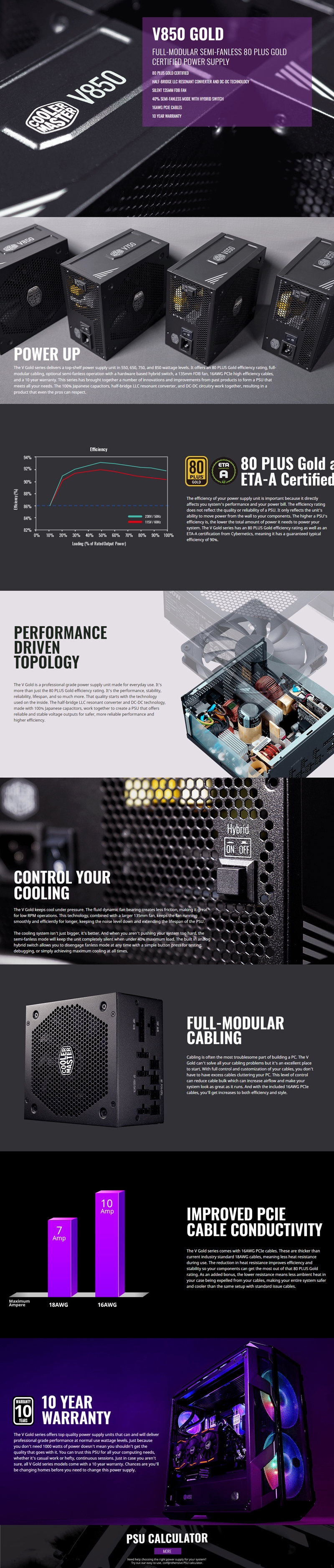 COOLER MASTER V 850W GOLD, FULLY MODULAR CABLE DESIGN, 80 PLUS GOLD CERTIFIED, SEMI-FANLES