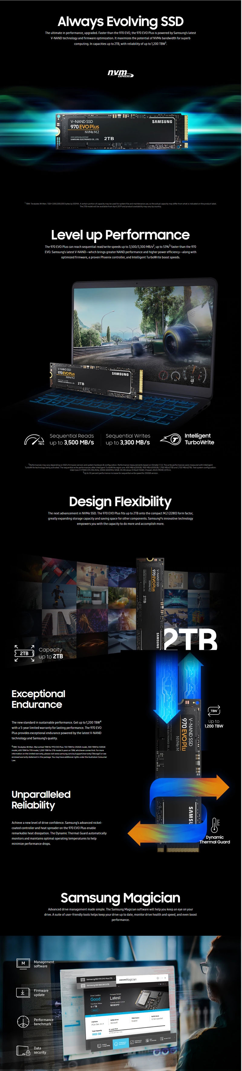 The ultimate in performance, upgraded. Faster than the 970 EVO, the 970 EVO Plus is powered by Samsungâs latest V-NAND technology and firmware optimization. It maximizes the potential of NVMe bandwidth for superb computing. In capacities up to 2TB, with reliability of up to 1,200 TBW1.