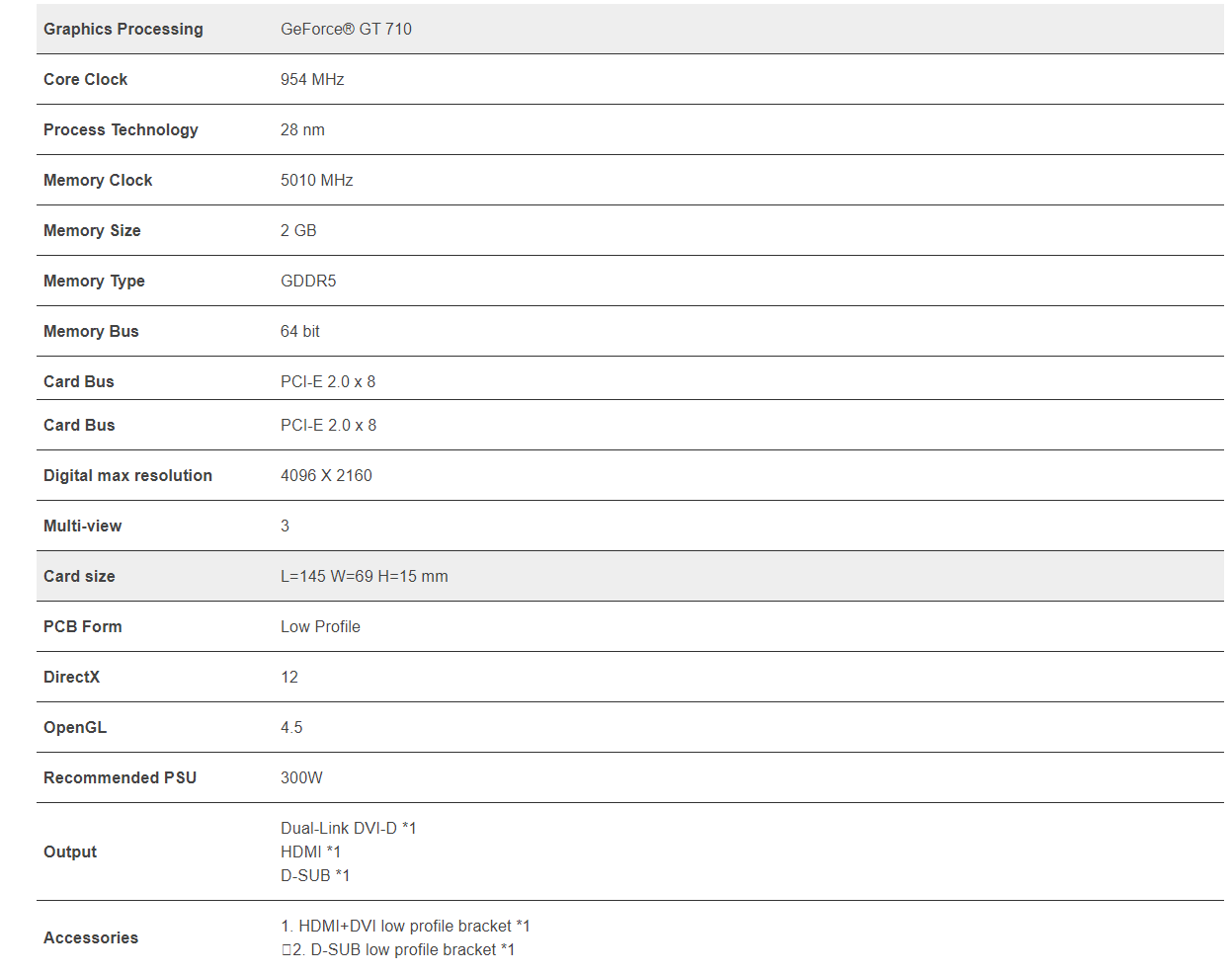 NVIDIA, GT 710, D5, 954MHz, 2GB GDDR5, 1xHDMI, 1xDVI, 1xD-Sub, Low Profile, 1xFan, 300W, 3 Years Warranty