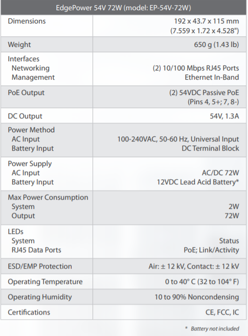 Two, 10/100 Ethernet, 54V Passive PoE output, switch-ports