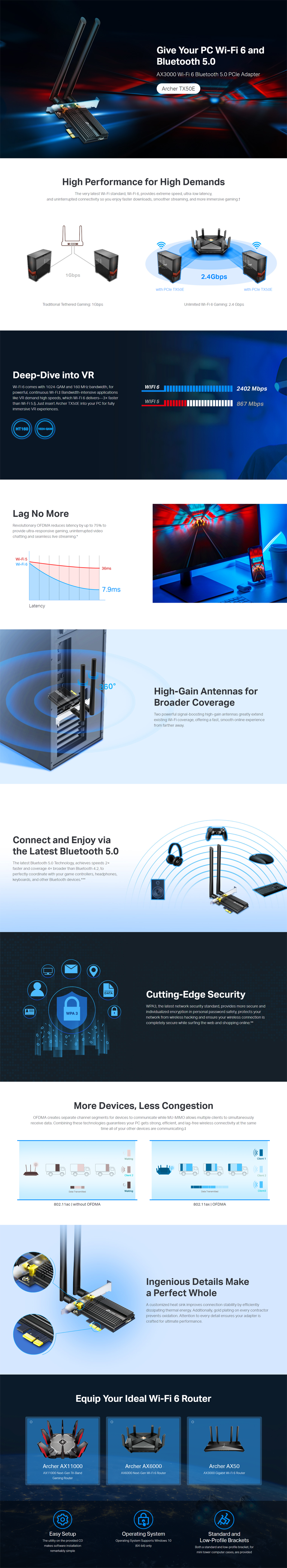 TP-Link Archer TX50E AX3000 Wi-Fi 6 Bluetooth 5.0 PCIe Adapter LAN 802.11bgn 5 GHz 2402Mbps Bluetooth 5.0 (WIFI6)