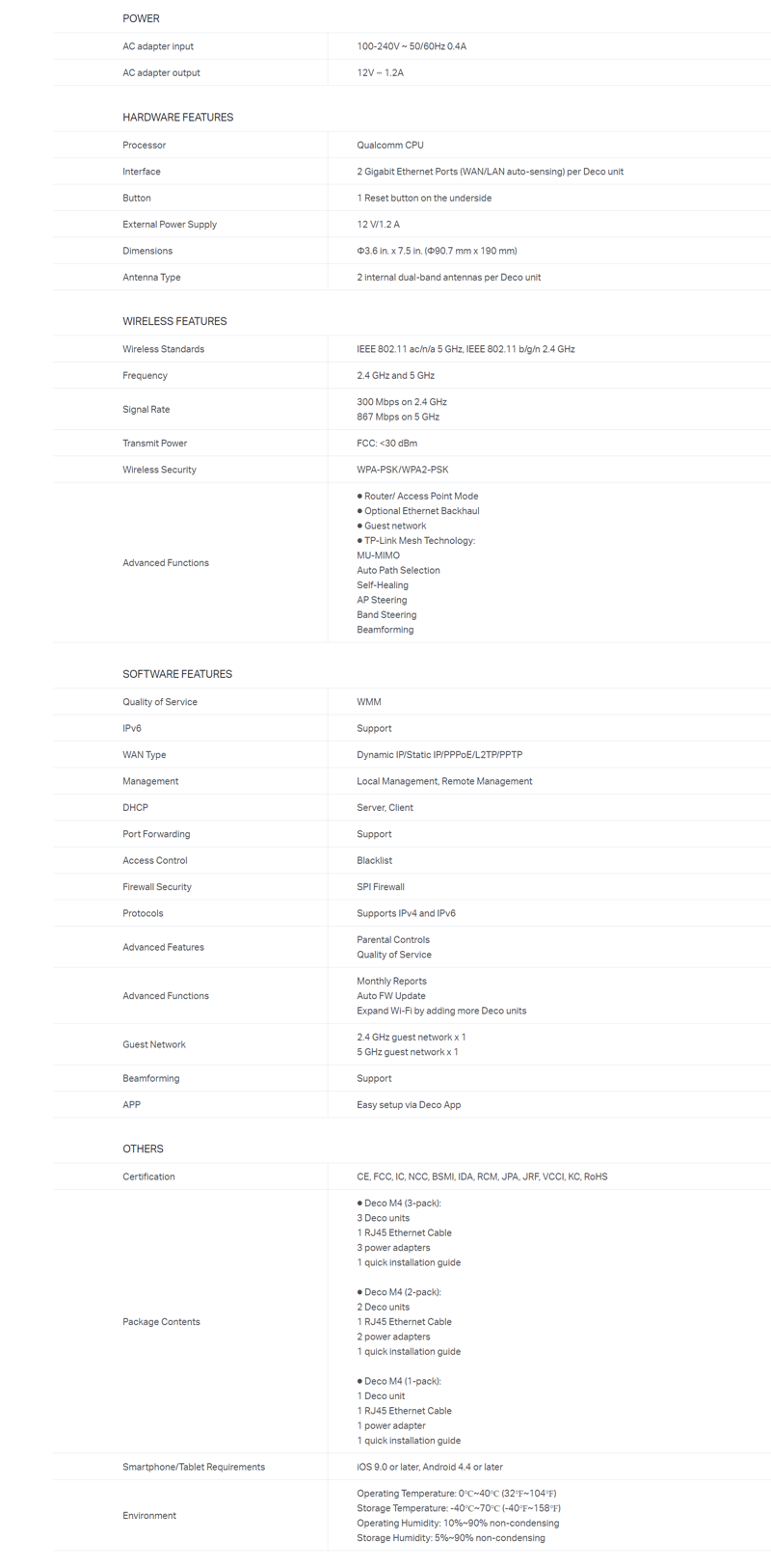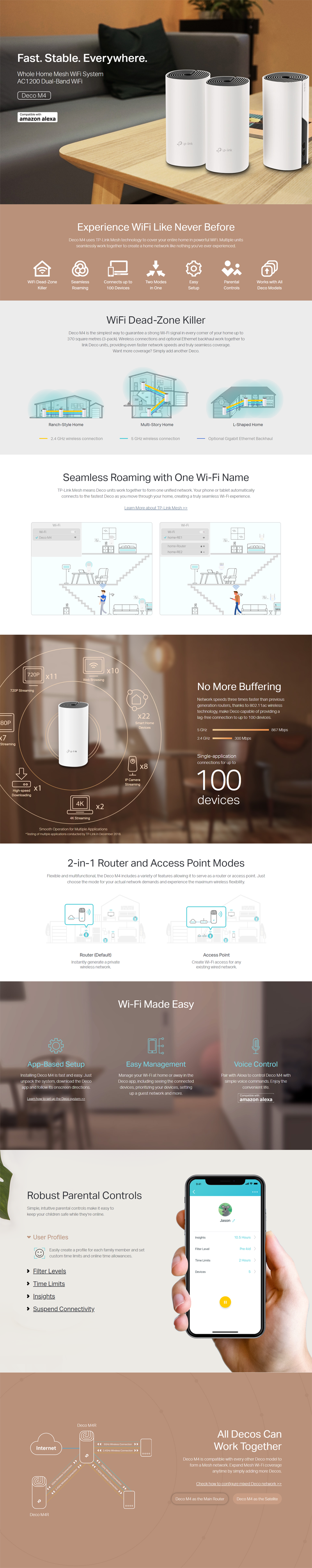 - Deco M4 provides fast and stable connections with speeds of up to 1167 Mbps and works with major internet service provider (ISP) and modem.*