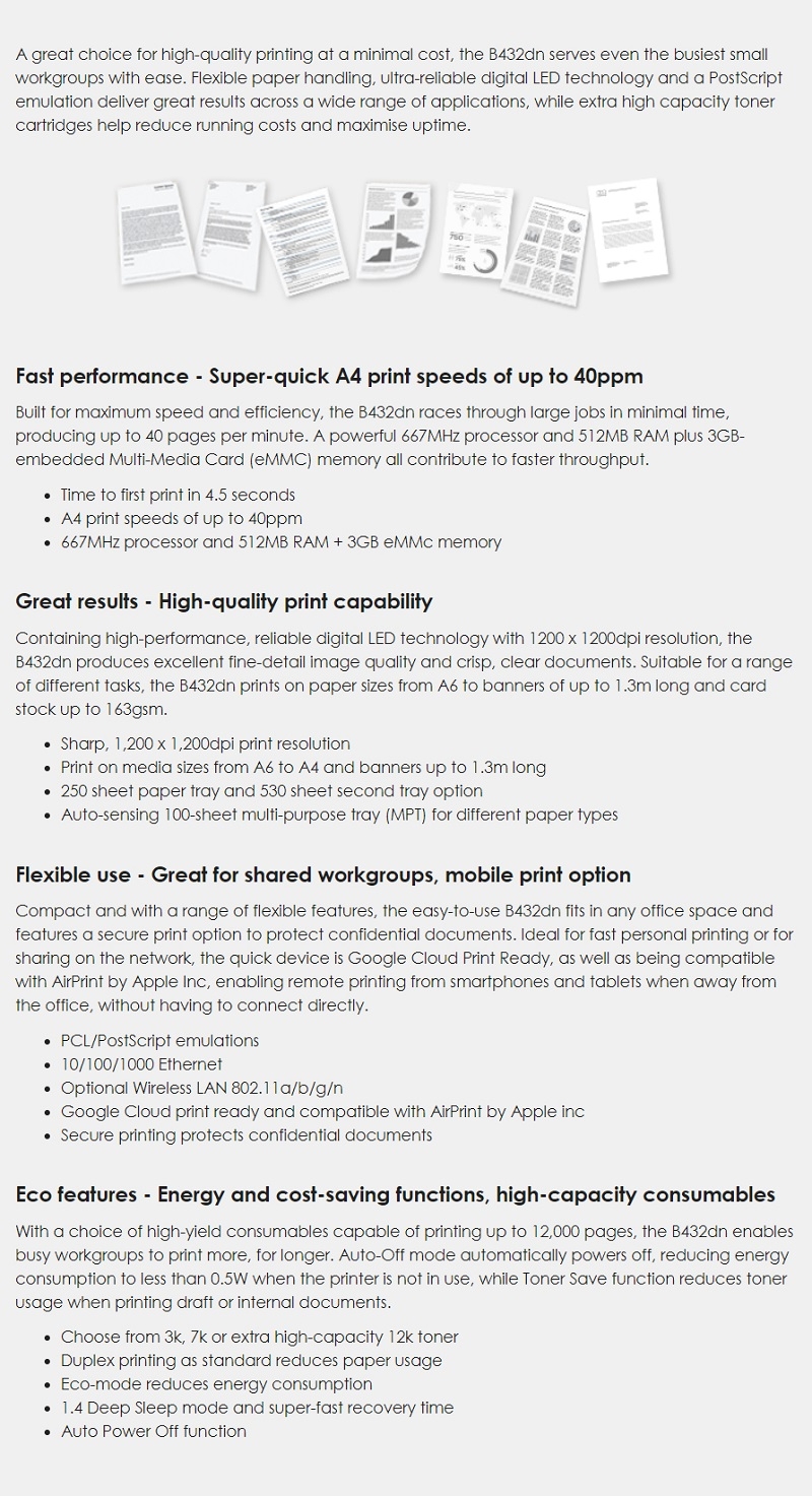 Built for maximum speed and efficiency, the easy-to-use B432dn A4 desktop mono printer provides advanced productivity features including powerful processor and memory in a budget-friendly, compact desktop printer