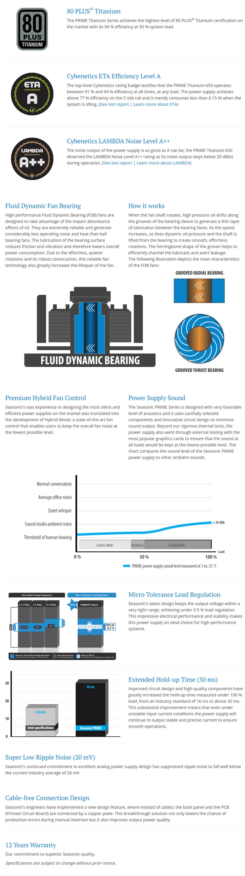 Seasonic's top-notch design shines through this top-notch power supply technology, where high level components are assembled into an optimal circuit design to guarantee the highest level of electrical performance. The PRIME 850 Titanium achieves 80 PLUS?? Titanium certification, where efficiency is 94 % at 50 % load. This leading member of the series boasts an improved DC to DC converter design where pins and a copper plate replace cables to connect the back panel and the PCB for increased efficiency. Fully modular cabling makes this power supplies one of the most versatile high-end choices for PC enthusiasts.
