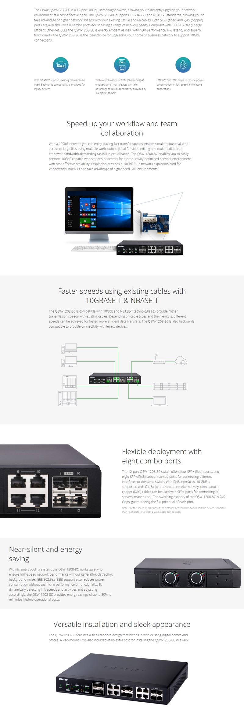 QSW-1208-8C: Twelve 10GbE SFP+ ports with shared eight 10GBASE-T ports unmanage switch, NBASE-T support for 5-speed auto negotiation (10G/5G/2.5G/1G/100M)