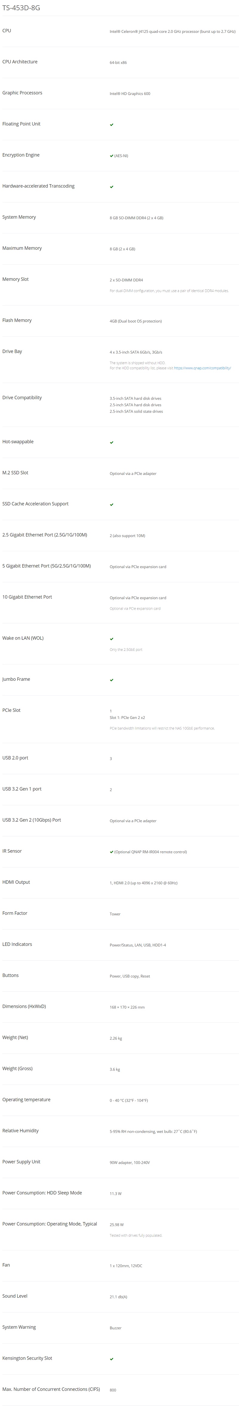 Qnap Ts-453D-8G 4-Bay Nas Intel Celeron J4125 Quad-Core 2.0Ghz (Up To 2.7Ghz) 8Gb Ddr4 Sodimm Ram (2X4Gb Max 8Gb Total) 2X 2.5G Lan 1X Hdmi 2.0 (Ts-453D-8G)